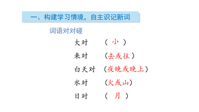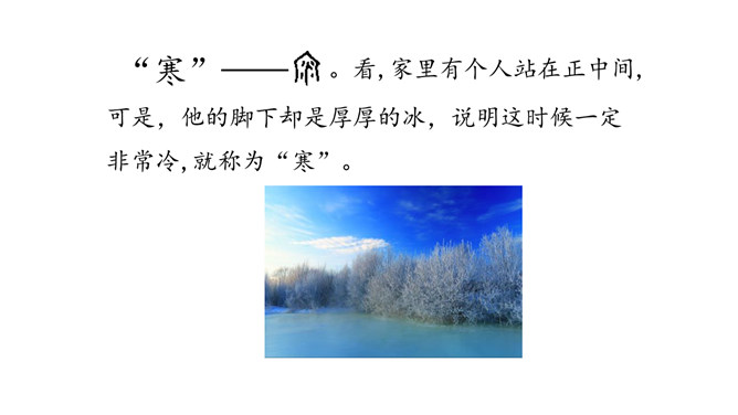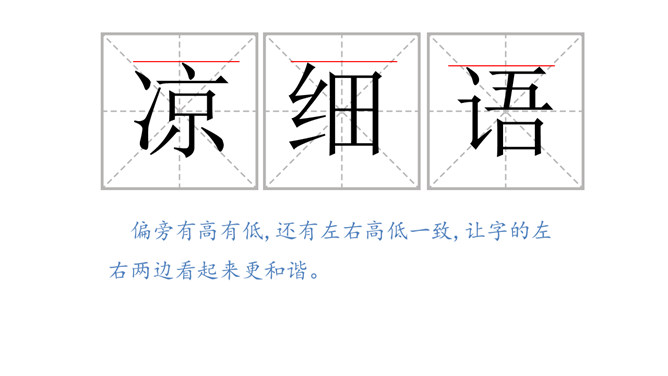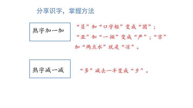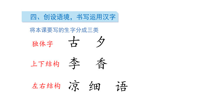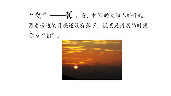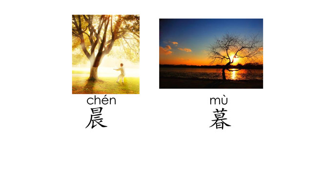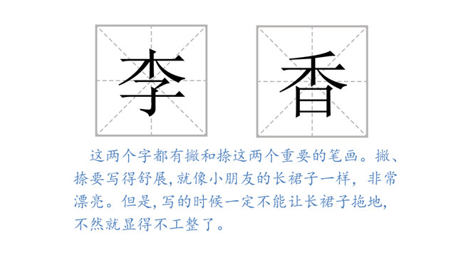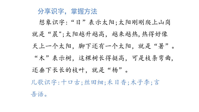 分享识字,掌握方法。想象识字:“日”表示太阳;太阳刚刚爬上山岗就是“晨";太阳越升越高,越来越热,热得好像天上一个太阳,脚下还有一个太阳,就是“暑”。“木”表示树,这棵树长得挺高,可是枝条弯曲,还垂下长长的枝叶,就是“杨”。儿歌识字:十口古;丝田细;禾日香;木子李;言吾语。这两个字都有撇和捺这两个重要的笔画。撇、捺要写得舒展,就像小朋友的长裙子一样,非常漂亮。但是,写的时候一定不能让长裙子拖地,不然就显得不工整了。所属专题:古对今ppt。