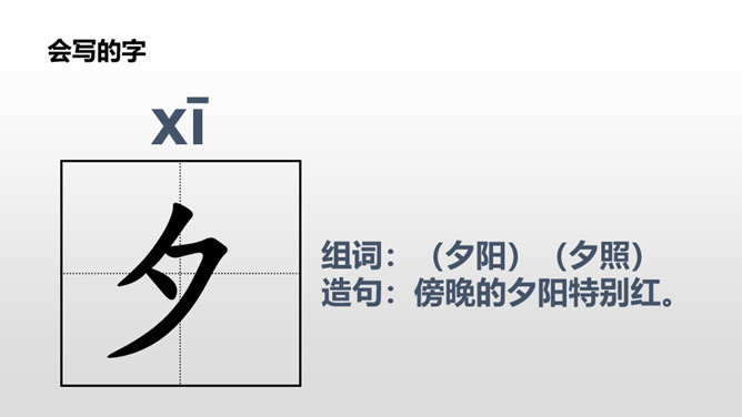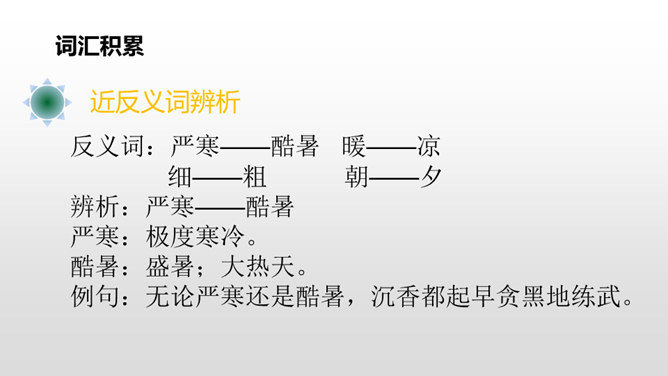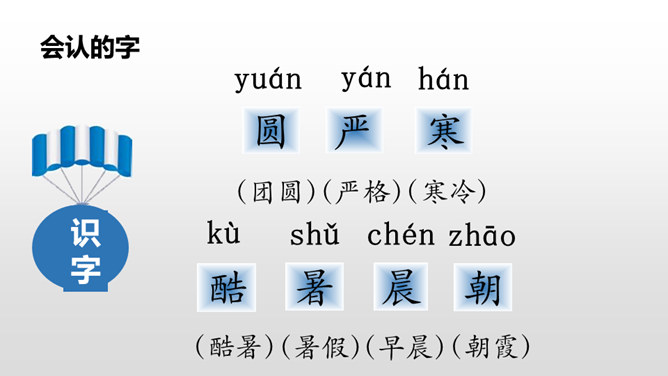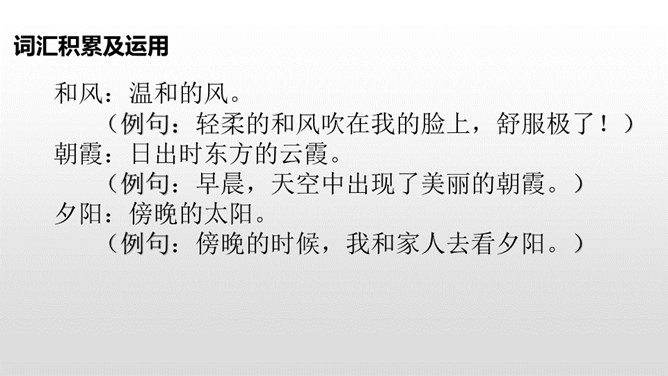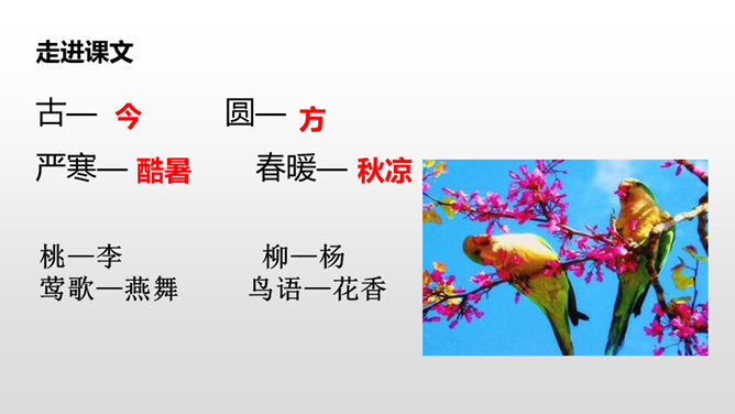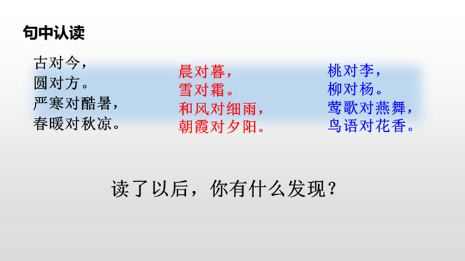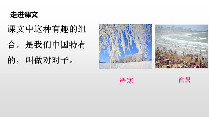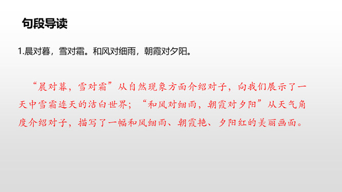 “晨对暮,雪对霜”从自然现象方面介绍对子,向我们展示了一天中雪霜连天的洁白世界;“和风对细雨,朝霞对夕阳”从天气角度介绍对子,描写了一幅和风细雨、朝霞艳、夕阳红的美丽画面。“桃、李”是水果,“柳、杨”是树木,这两对描写了硕果累累、绿树成行的景象。仿照课文内容,编写一组对子歌。 课文中这种有趣的组合,是我们中国特有的,叫做对对子。在音乐声中,学生自由读课文。所属专题:古对今ppt。