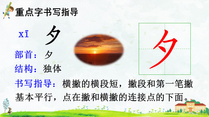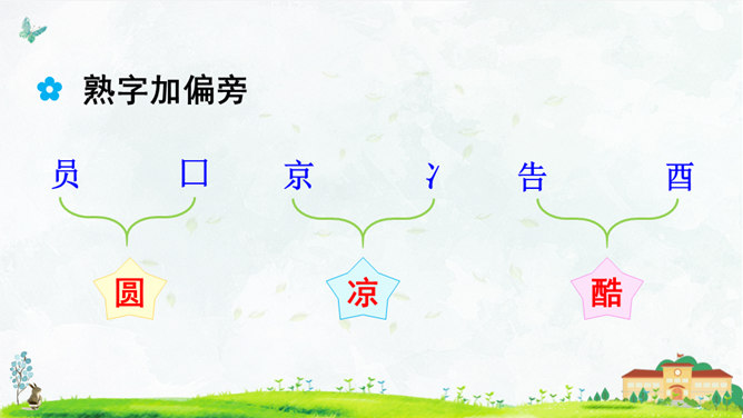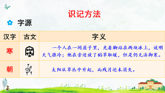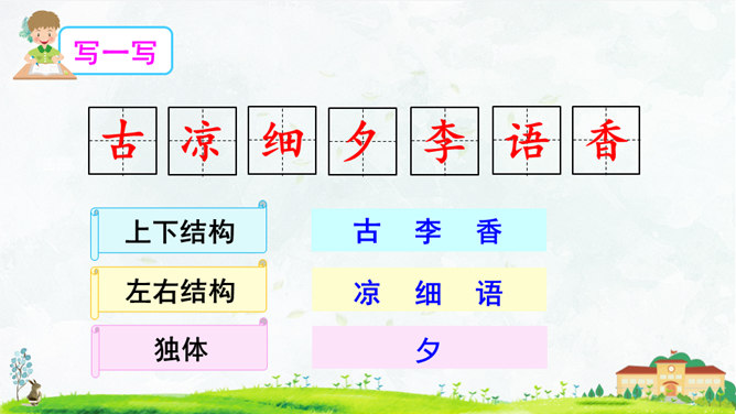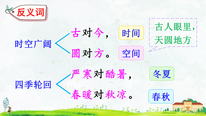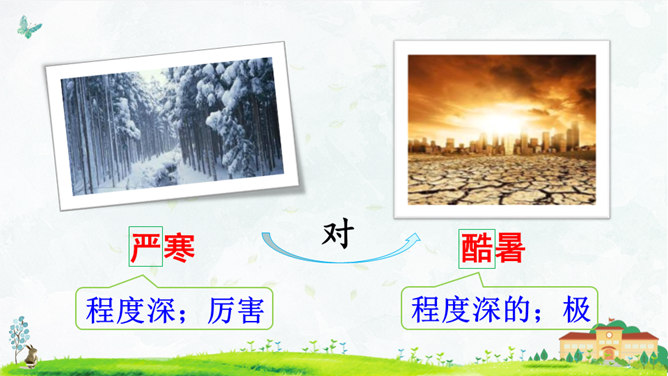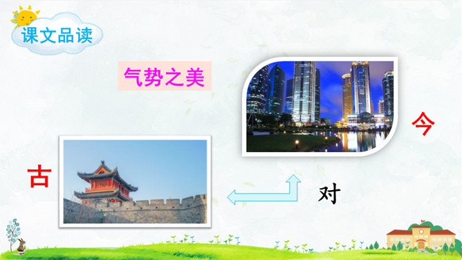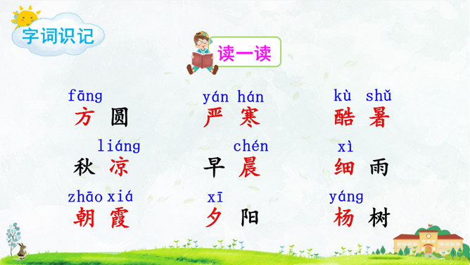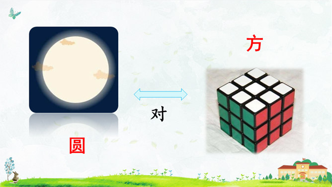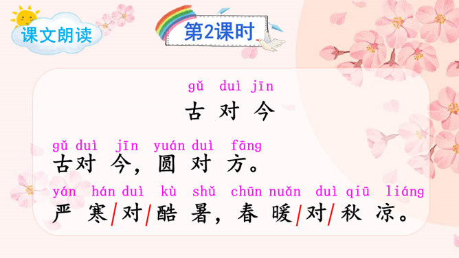 这首对韵歌以( 对子 )的形式描绘了四季气候及景物特点,采用(写意画 )的方式展示了“莺歌燕舞、鸟语花香”的美好景象。朗读指导:朗读本文,我们可以体会到万物的轮回、生长是那样神奇、美妙,要读出感情和韵律。“对”字稍读轻,对应的名词稍读重。读好韵脚“ɑnɡ”(方、凉、霜、阳、杨、香)。朗读并背诵课文;正确书写本课生字。收集对子,与同学课下交流并背诵。比一比,谁收集得多,背得多。所属专题:古对今ppt。