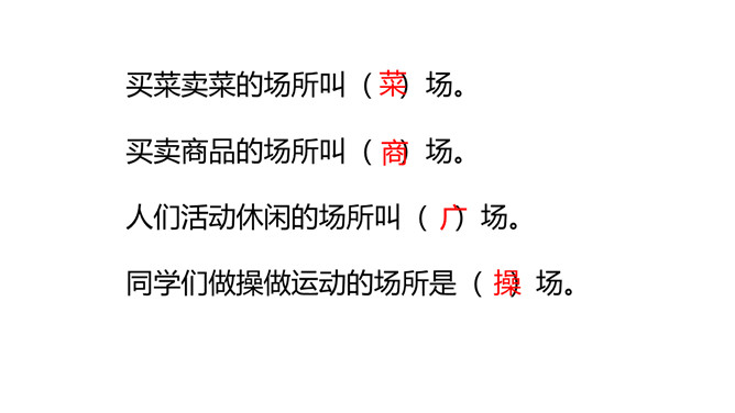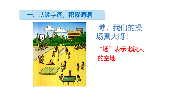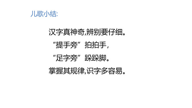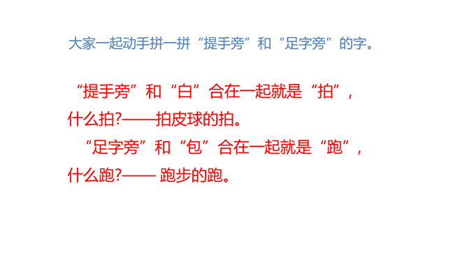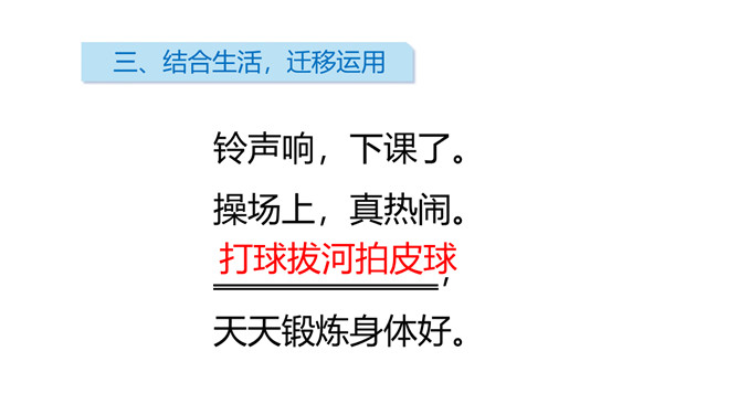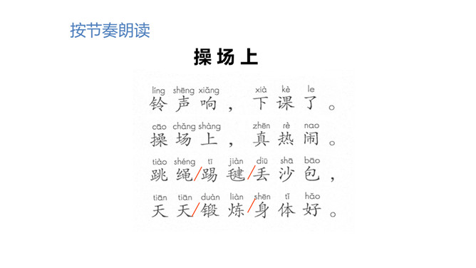 儿歌小结:汉字真神奇,辨别要仔细。“提手旁”拍拍手,“足字旁”跺跺脚。掌握其规律,识字多容易。用 “我喜欢……”的句式,说说你喜欢什么体育活动。暑假里,我喜欢在小区游泳池里游泳。“足”和“声”都是上下结构,都有上小下大的特点。范写“足”字,撇捺相对应,足才显得稳重。“声”要重点指导“士字头”的上横长,下横短,中间部分的小短竖要与“士字头”的一竖对齐,最后一撇要舒展。所属专题:操场上ppt。