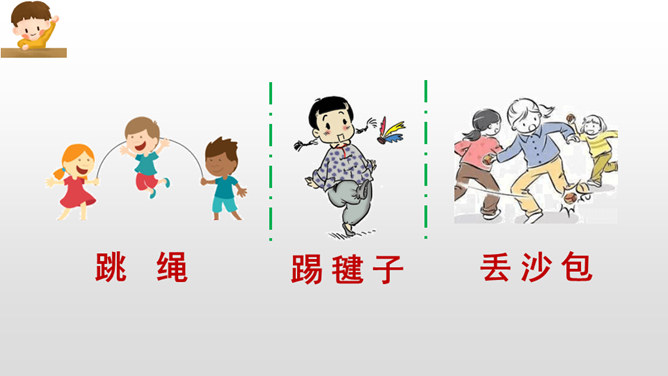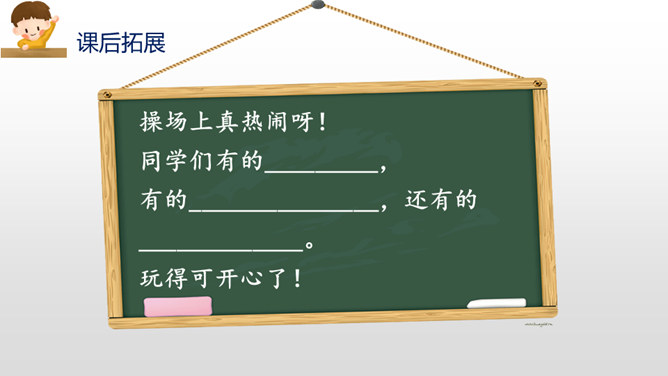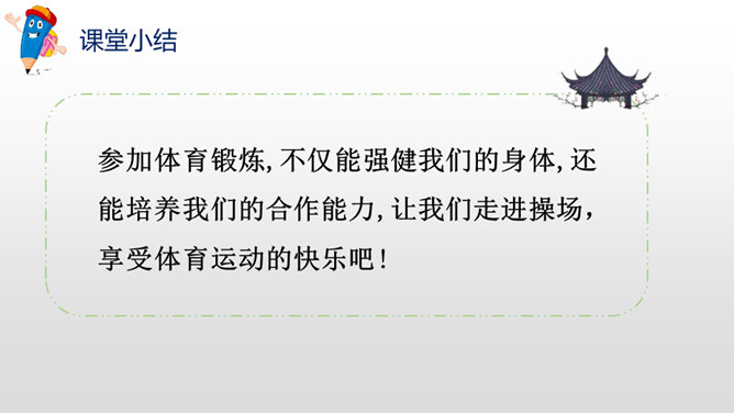 参加体育锻炼,不仅能强健我们的身体,还能培养我们的合作能力,让我们走进操场,享受体育运动的快乐吧!妈妈每天都会打扫卫生。老师的歌声特别好听。爷爷奶奶的身体很健康。下节课是体育课。所属专题:操场上ppt。