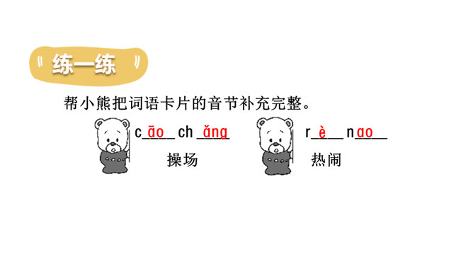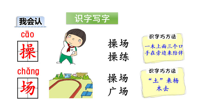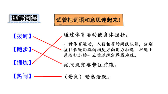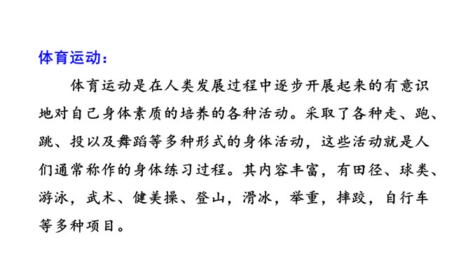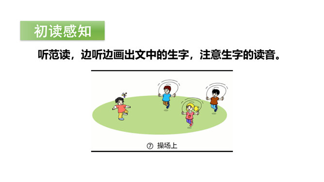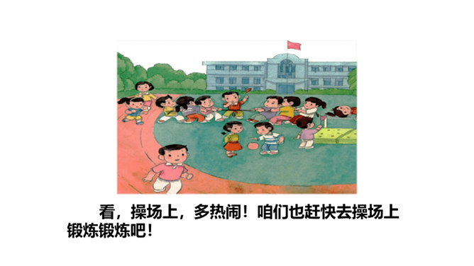 指导朗读:1.自由读一读课文;2.朗读指导:读儿歌时,我们要注意两处轻声和最后一句的停顿。如“下课了”和“热闹”读轻声,我们在读得正确、流利的基础上,读出韵味来。初读课文后,你感受到了什么?示例:初读课文后,我感受到了各项体育活动的乐趣。听范读,边听边画出文中的生字,注意生字的读音。看,操场上,多热闹!咱们也赶快去操场上锻炼锻炼吧!所属专题:操场上ppt。