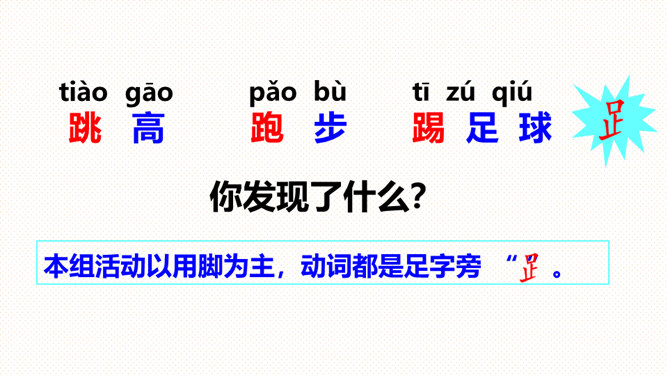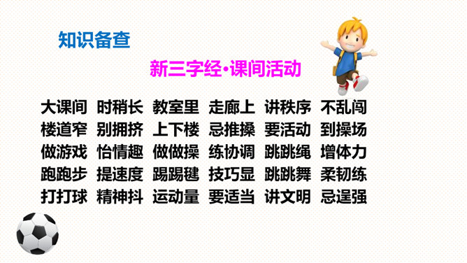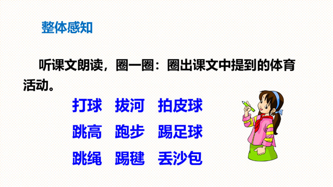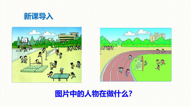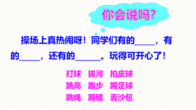 读一读,说一说:儿歌描写的是什么时候的内容?同学们在干什么?下课后同学们在操场上活动的情景。同学们有的跳绳,有的踢毽,有的丢沙包。(1)熟读课文,会说体育活动的名称。(2)你还喜欢什么体育活动?和同学说一说。朗读指导:本文是一组儿歌,描述了下课后同学们在操场上进行各种活动的情景。在朗读时,要注意停顿和重读,读出课间活动的快乐。你喜欢什么体育活动?和同学说一说。所属专题:操场上ppt。
