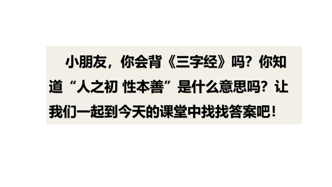 小朋友,你会背《三字经》吗?你知道“人之初 性本善”是什么意思吗?让我们一起到今天的课堂中找找答案吧!旧时流行的一种蒙学课本。以三字一句的韵文写成。查查字典,说一说:课文题目“人之初”是什么意思?是自宋代以来,古人的启蒙读物。它传递了很多为人处事的知识。课文中选取的片段要告诉我们什么呢?让我们一起到课文中找找答案吧!文中的每一小节都要告诉我们什么道理呢?所属专题:人之初ppt。