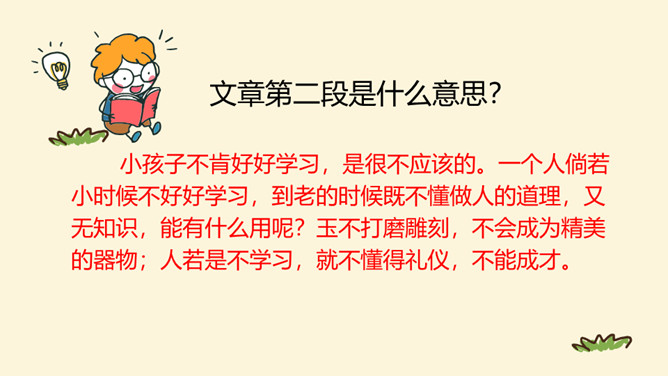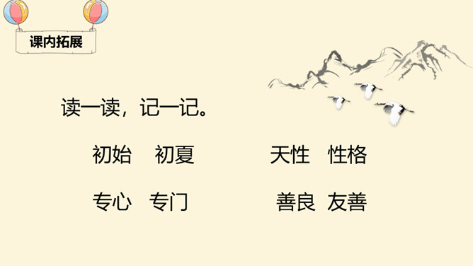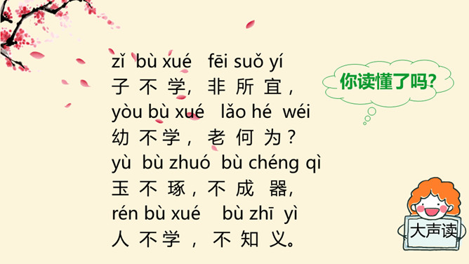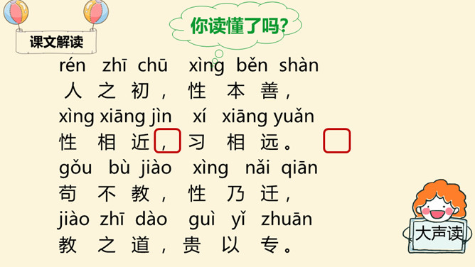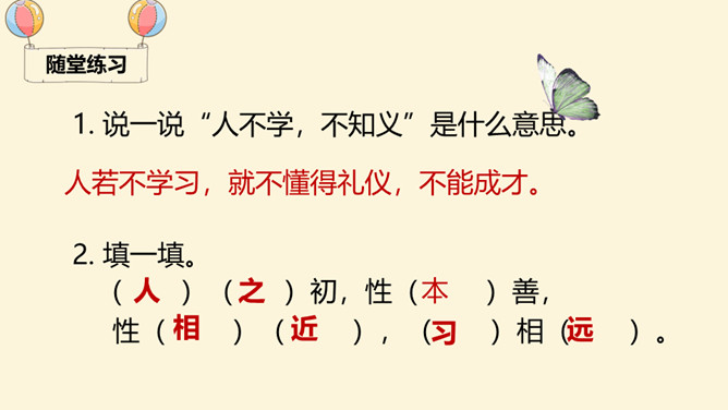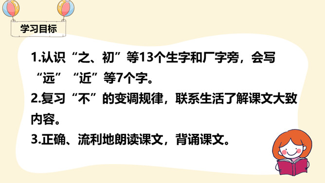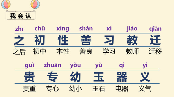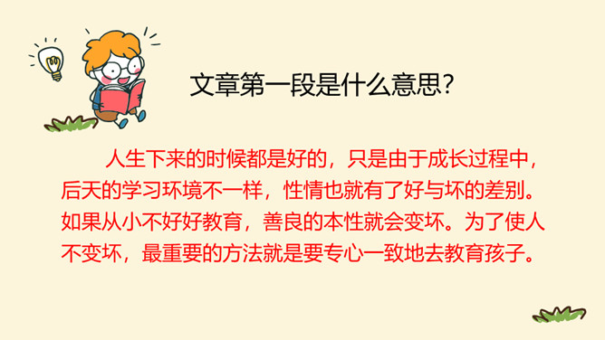 听朗读,然后自己试着读一读,注意读准字音,不会的字多读几遍!学习目标:1.认识“之、初”等13个生字和厂字旁,会写 “远”“近”等7个字。2.复习“不”的变调规律,联系生活了解课文大致内容。3.正确、流利地朗读课文,背诵课文。文章第一段是什么意思?人生下来的时候都是好的,只是由于成长过程中,后天的学习环境不一样,性情也就有了好与坏的差别。如果从小不好好教育,善良的本性就会变坏。为了使人不变坏,最重要的方法就是要专心一致地去教育孩子。所属专题:人之初ppt。