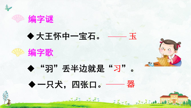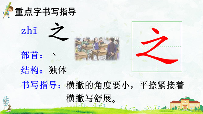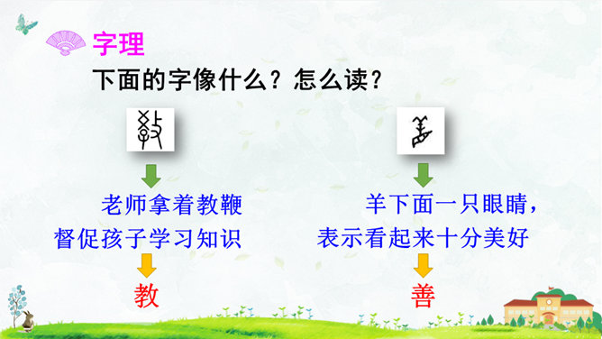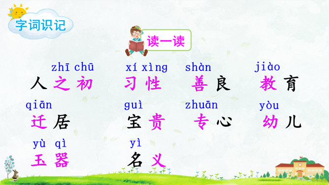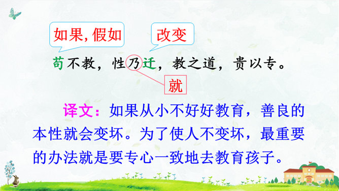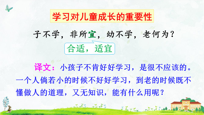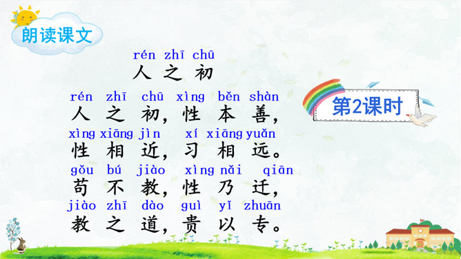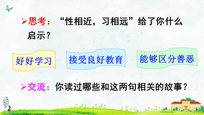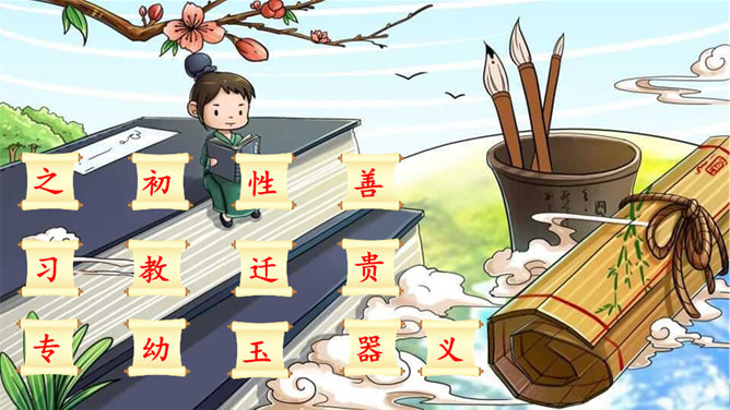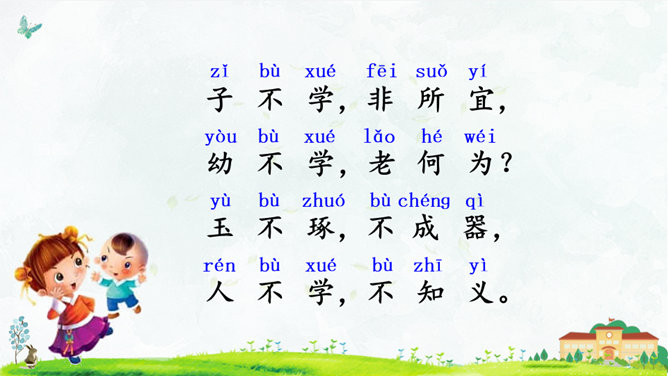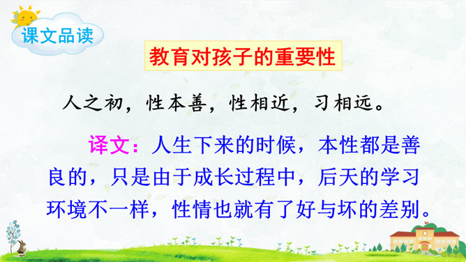 朗读指导:语气舒缓,读出韵律感。可以边读边拍手,感受《三字经》的节奏,读好文中“不”的变调。朗读课文,背诵课文。正确书写本课生字。搜集出自《三字经》的小故事,再全班交流。本课节选自《三字经》,第1个片段讲述了(教育孩子 )的重要性,第2个片段讲述了(学习)对儿童成长的重要性,劝诫我们应(好学上进)、(有所作为),使得人生有意义。所属专题:人之初ppt。