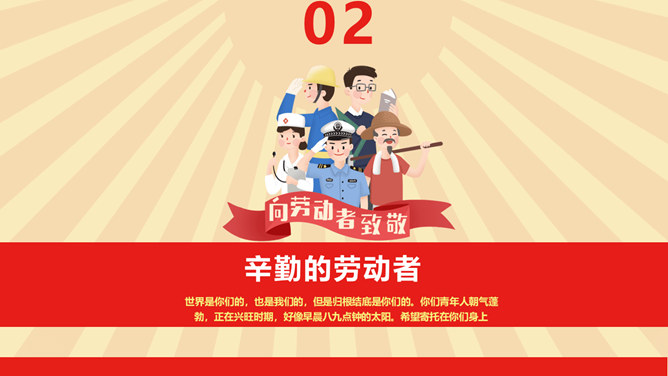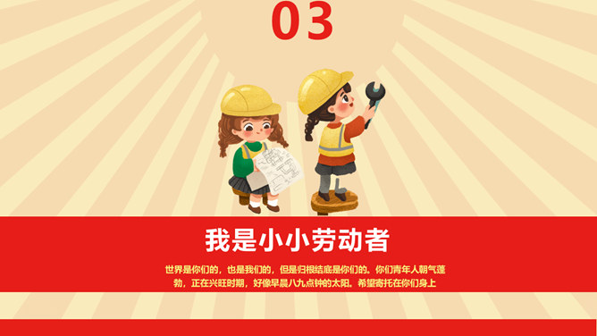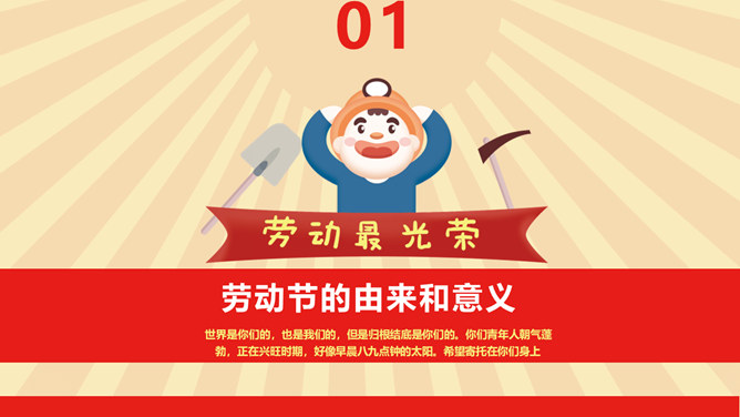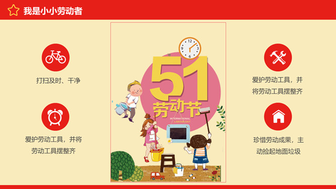 卡通五一劳动节班会PPT模板。一套中小学五一劳动节主题班会幻灯片模板,可爱卡通设计风格,动态播放效果。