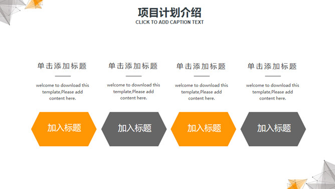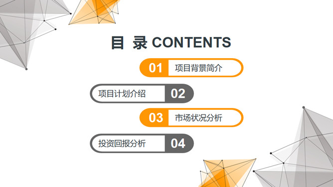点线科技商业计划书PPT模板。一天简约通用幻灯片模板,黄灰配色,点线科技风设计,适合商业创业计划等用途。