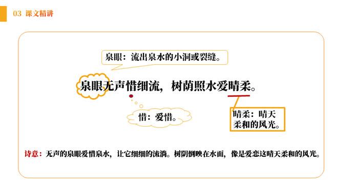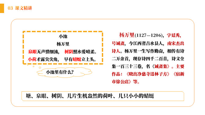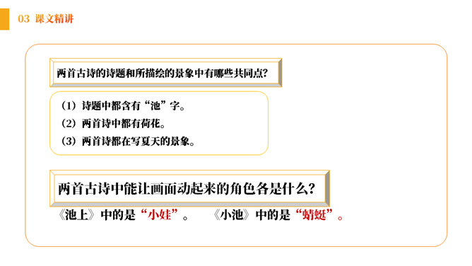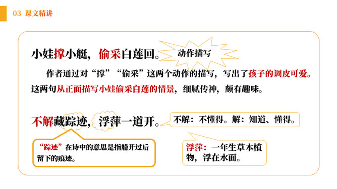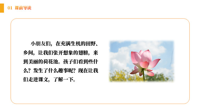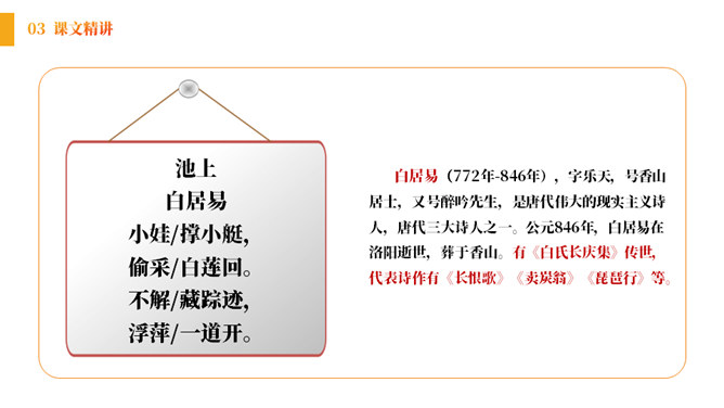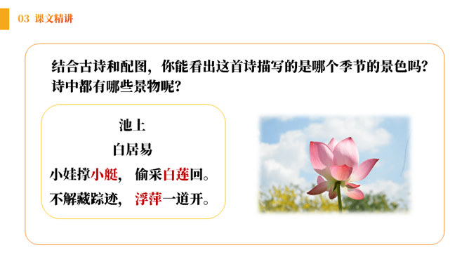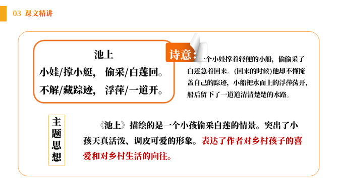 小朋友们,在充满生机的田野、乡间,让我们张开想象的翅膀,来到美丽的荷花池。孩子们看到些什么?发生了什么趣事呢?结合古诗和配图,你能看出这首诗描写的是哪个季节的景色吗?诗中都有哪些景物呢?《池上》描绘的是一个小孩偷采白莲的情景。突出了小孩天真活泼、调皮可爱的形象。表达了作者对乡村孩子的喜爱和对乡村生活的向往。所属专题:池上ppt。