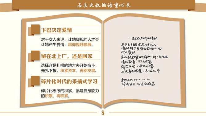 《摸着石头过河》读书笔记PPT。每当读完一本书,就好像和一位朋友聊了多时,不仅分享了各自的观点,而且受益良多。而当你放下老友,又会期待着与新朋友的邂逅。