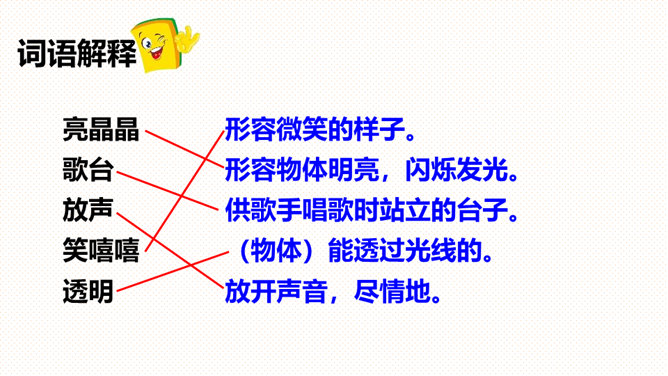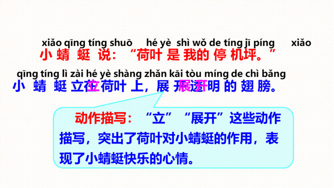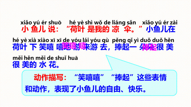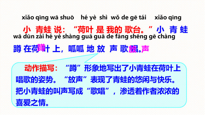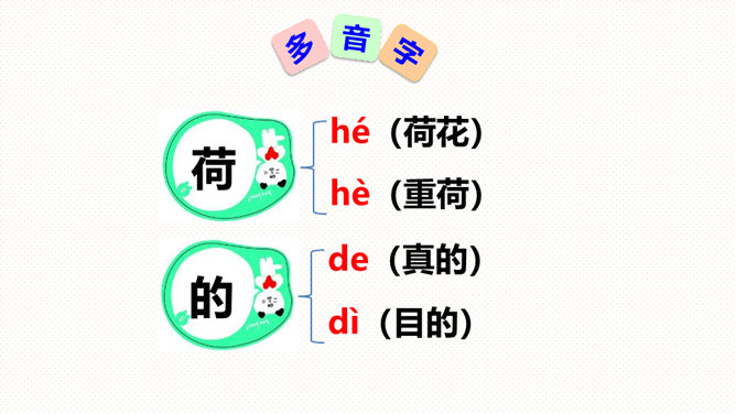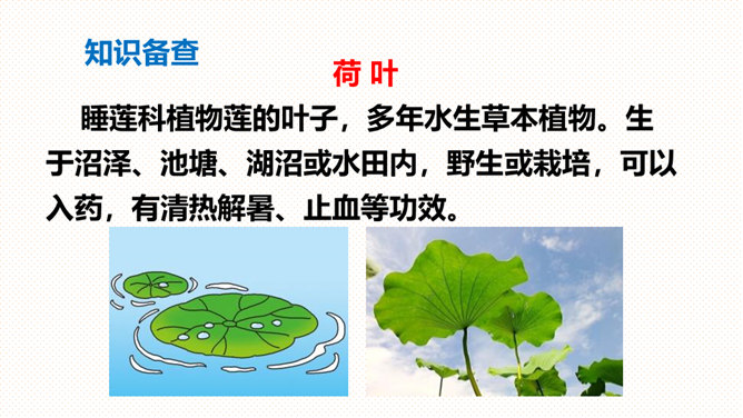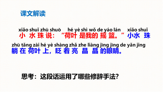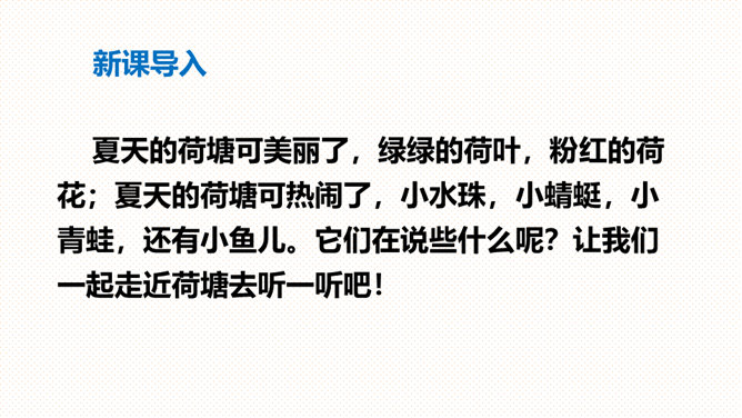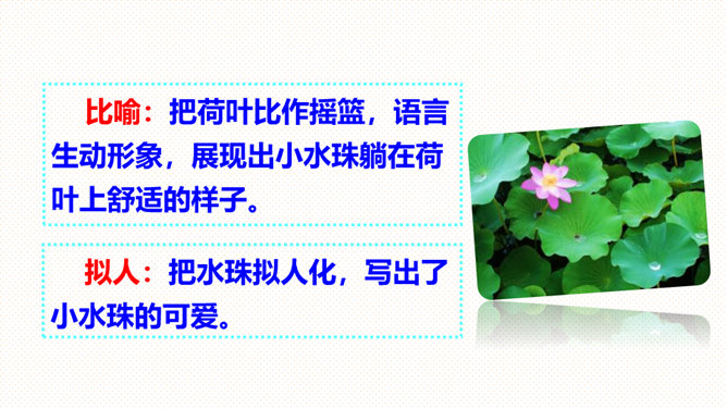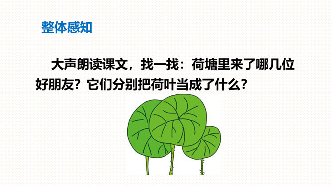 (1)朗读指导:朗读时要带着高兴的心情,用轻快、活泼的语调来读。(2)背诵指导:全文富有情趣,背诵不会太难。背诵时要抓住第2-5自然段结构相同的特点,抓住描写顺序“小水珠→小蜻蜓→小青蛙→小鱼儿”来背诵即可。课文叙述了荷叶对小水珠、小蜻蜓、小青蛙和小鱼儿的作用,表达了小动物们对荷叶的喜爱之情。大声朗读课文,找一找:荷塘里来了哪几位好朋友?它们分别把荷叶当成了什么?所属专题:荷叶圆圆ppt。