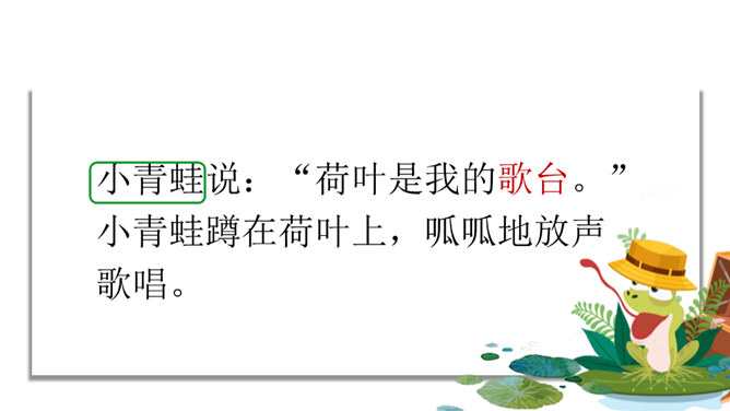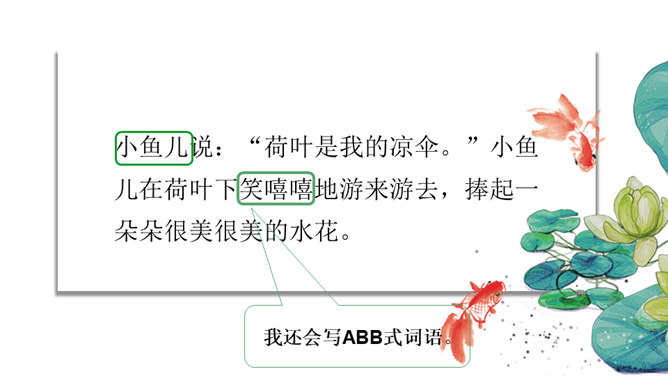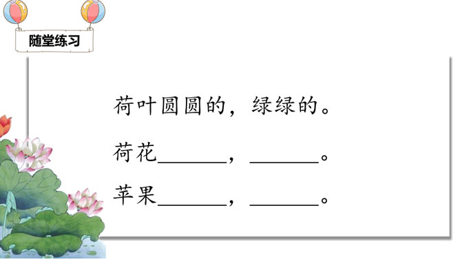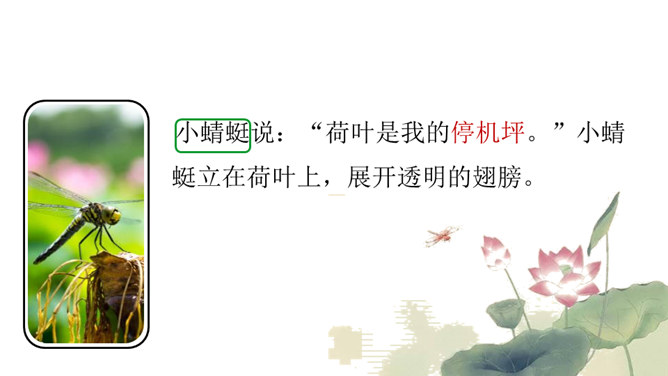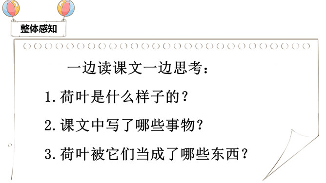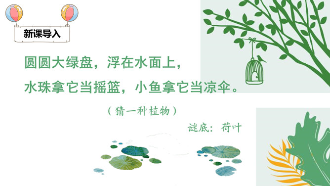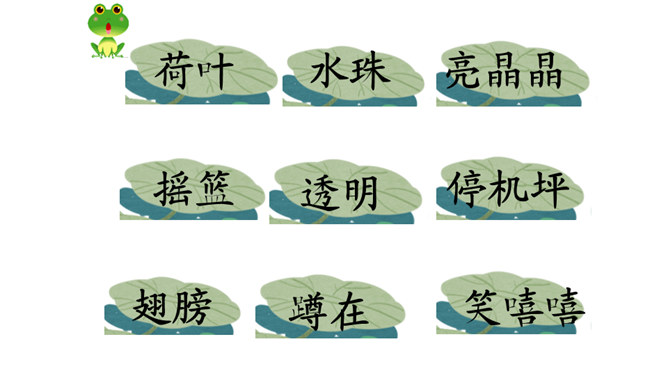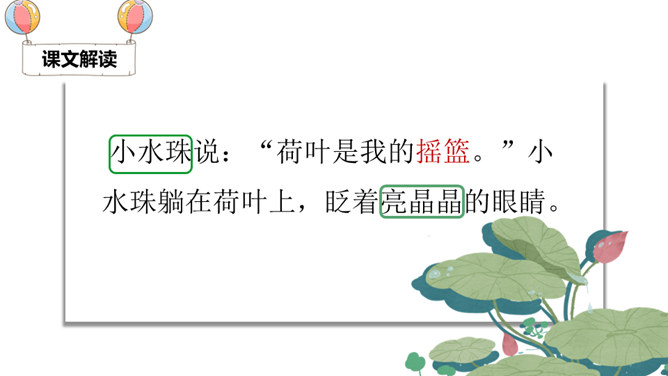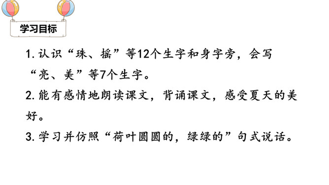 学习目标:1.认识“珠、摇”等12个生字和身字旁,会写 “亮、美”等7个生字。2.能有感情地朗读课文,背诵课文,感受夏天的美好。3.学习并仿照“荷叶圆圆的,绿绿的”句式说话。听朗读,然后自己试着读一读,注意读准字音,不会的字多读几遍!一边读课文一边思考:1.荷叶是什么样子的?2.课文中写了哪些事物?3.荷叶被它们当成了哪些东西?所属专题:荷叶圆圆ppt。