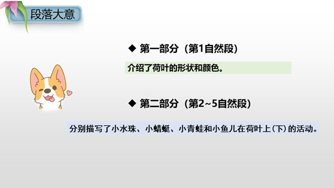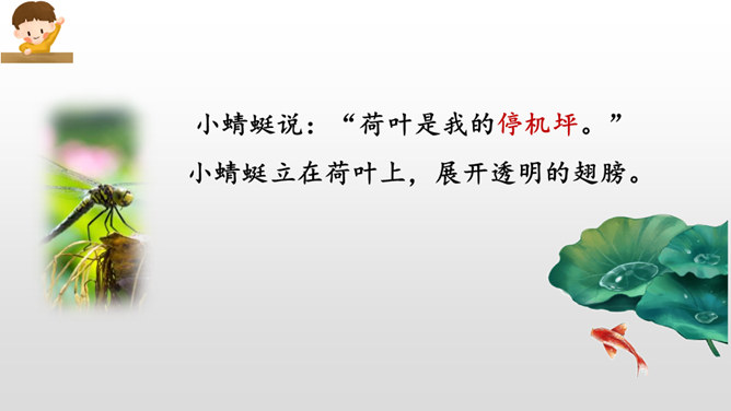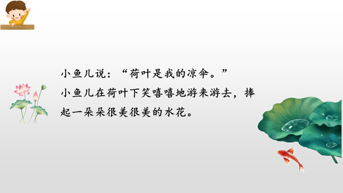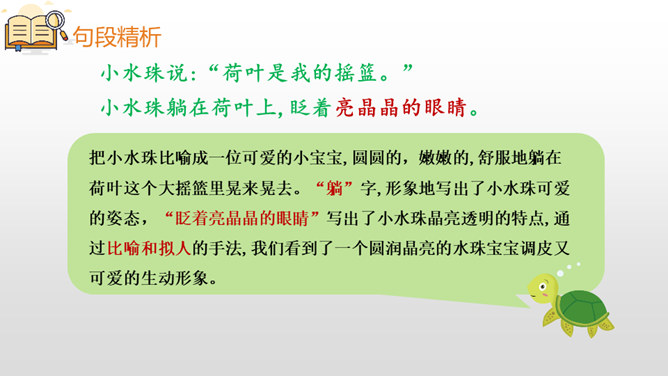 把小水珠比喻成一位可爱的小宝宝,圆圆的,嫩嫩的,舒服地躺在荷叶这个大摇篮里晃来晃去。“躺”字,形象地写出了小水珠可爱的姿态,“眨着亮晶晶的眼睛”写出了小水珠晶亮透明的特点,通过比喻和拟人的手法,我们看到了一个圆润晶亮的水珠宝宝调皮又可爱的生动形象。大自然是美丽的,大自然中的动物、植物就像我们人类一样,友好相处,快乐生活,希望同学们能多多走进大自然,欣赏大自然的美景,发现大自然的奧妙。所属专题:荷叶圆圆ppt。