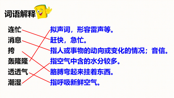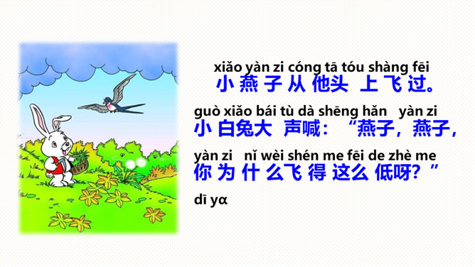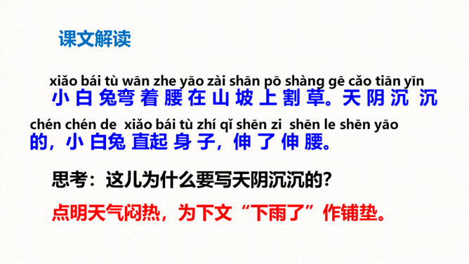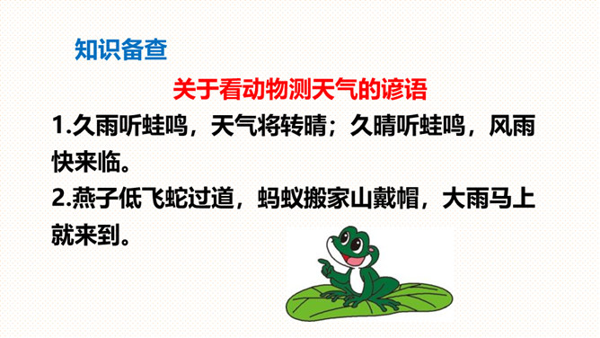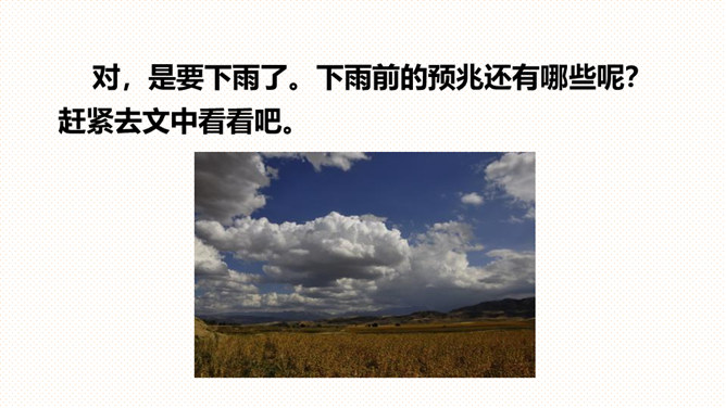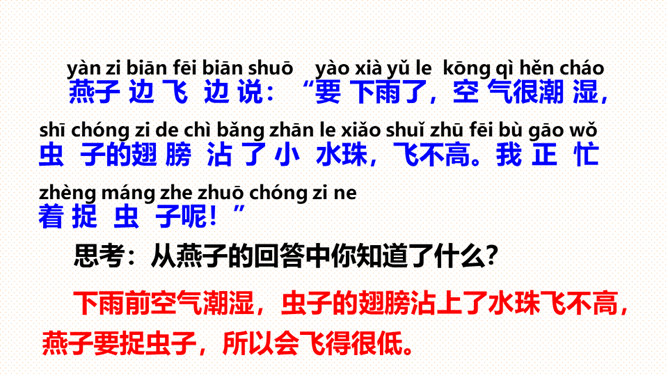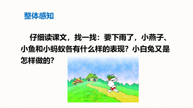 朗读课文。说说故事里有哪些动物,再分角色读一读。朗读指导:本文讲了小白兔在山坡上割草时,天阴沉沉的,低飞的燕子,游到水面的小鱼和搬家的蚂蚁都告诉他要下雨了。小白兔的问句,要读出疑问的语气;燕子回答小白兔的提问,语言要亲切;小鱼的话要读出关切的语气;蚂蚁的话要读出肯定的语气。想想燕子、小鱼、蚂蚁下雨前都在干什么。参考答案:下雨前燕子在低飞捉虫子,小鱼到水面上来透气,蚂蚁忙着搬东西。所属专题:要下雨了ppt。