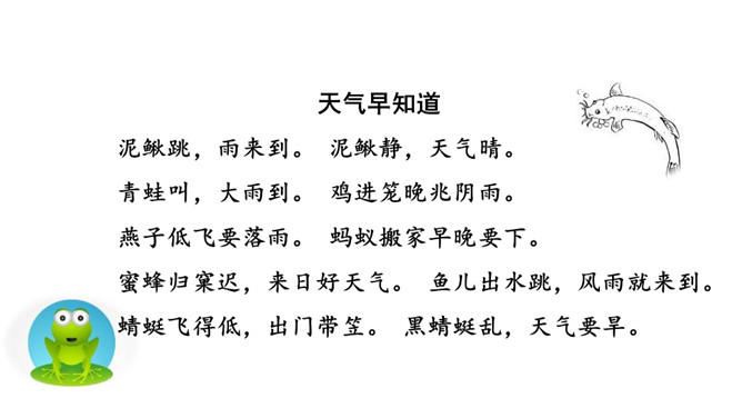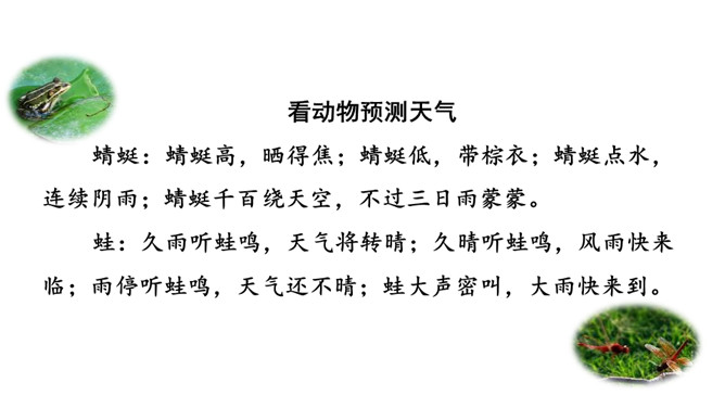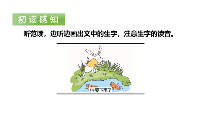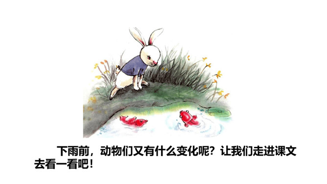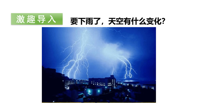 要下雨了,天空有什么变化?下雨前,动物们又有什么变化呢?让我们走进课文去看一看吧!听范读,边听边画出文中的生字,注意生字的读音。感情地朗读课文,再分角色读一读。初读课文后,你感受到了什么?示例:初读课文后,我感受到了观察大自然也能预测天气变化。所属专题:要下雨了ppt。