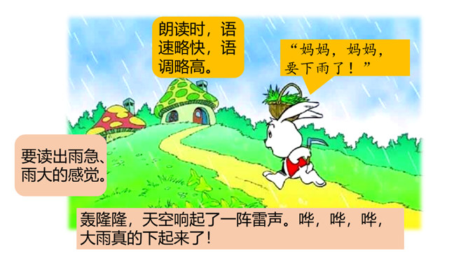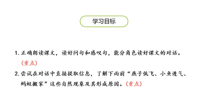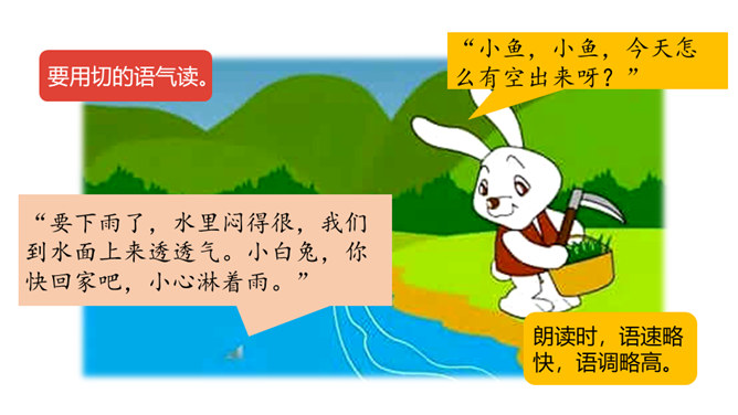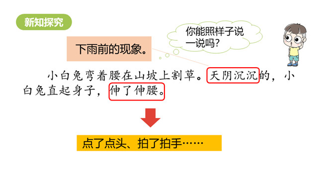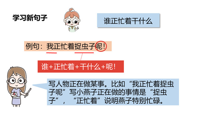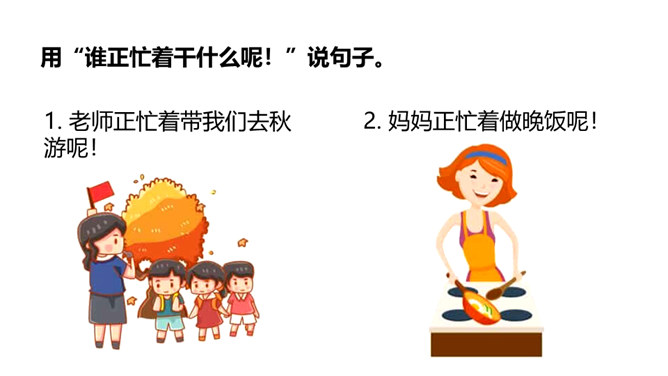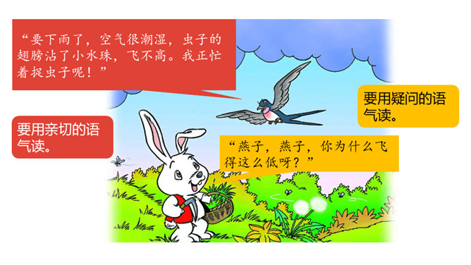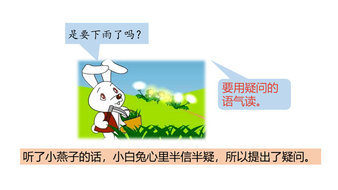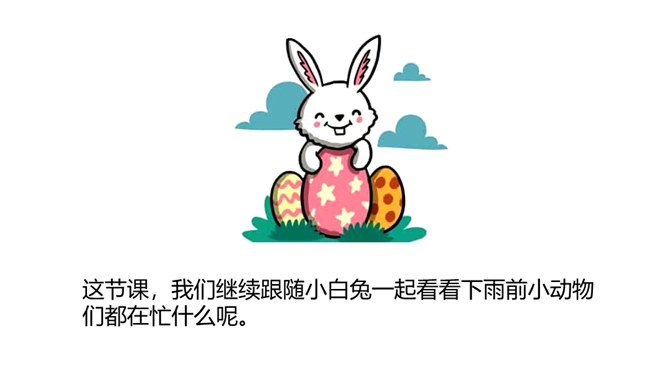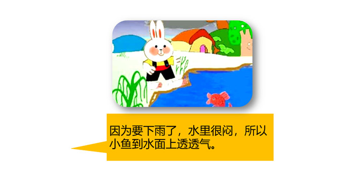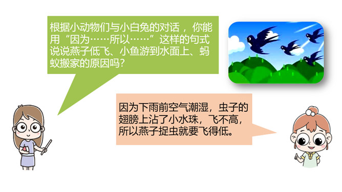 这节课,我们继续跟随小白兔一起看看下雨前小动物们都在忙什么呢。 写人物正在做某事。比如“我正忙着捉虫子呢”写小燕子正在做的事情是“捉虫子”,“正忙着”说明燕子特别忙碌。用“谁正忙着干什么呢!”说句子。老师正忙着带我们去秋游呢!妈妈正忙着做晚饭呢!听了小燕子的话,小白兔心里半信半疑,所以提出了疑问。根据小动物们与小白兔的对话 ,你能用“因为……所以……”这样的句式说说燕子低飞、小鱼游到水面上、蚂蚁搬家的原因吗?所属专题:要下雨了ppt。