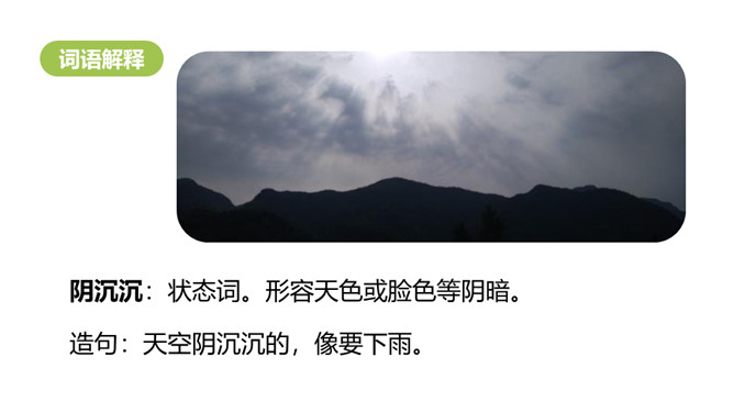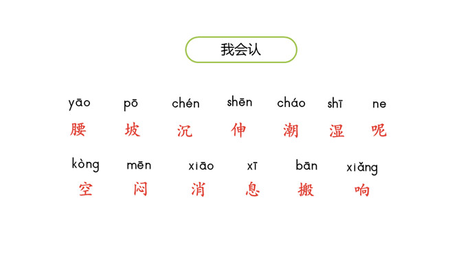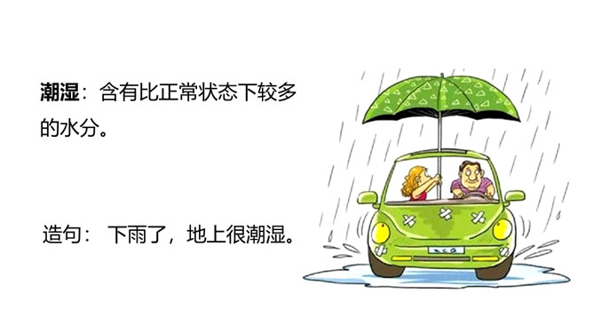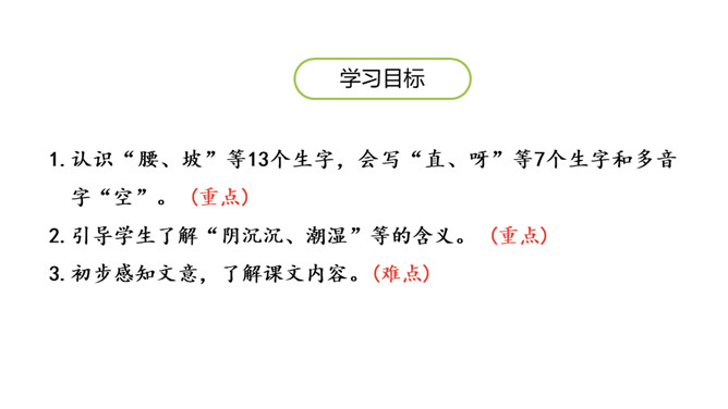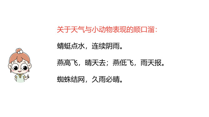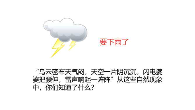 “乌云密布天气闷,天空一片阴沉沉,闪电婆婆把腰伸,雷声响起一阵阵”从这些自然现象中,你们知道了什么?学习目标:1.认识“腰、坡”等13个生字,会写“直、呀”等7个生字和多音字“空”。 (重点)2.引导学生了解“阴沉沉、潮湿”等的含义。 (重点)3.初步感知文意,了解课文内容。(难点)关于天气与小动物表现的顺口溜:蜻蜓点水,连续阴雨。燕高飞,晴天去;燕低飞,雨天报。蜘蛛结网,久雨必晴。所属专题:要下雨了ppt。