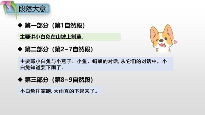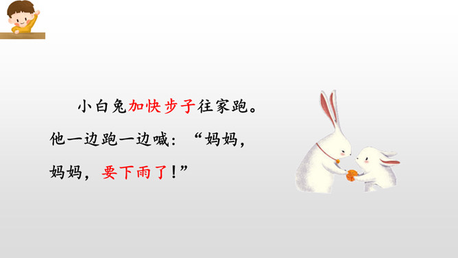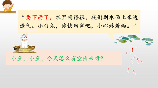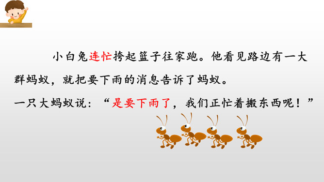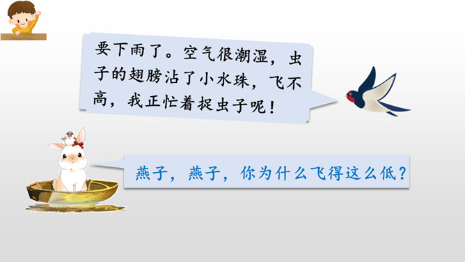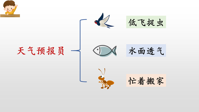 同学们,经过这节课的学习,我们不仅知道燕子、小鱼、蚂蚁是大自然的天气预报员,还了解了其他很多动植物预报天气的本领。大自然就是这样的神奇有趣,只要你善于观察研究,就一-定会发现更多更好玩的小秘密哟!我的文具盒里放着一把直尺。来呀,一起玩。海边有许多贝壳。我要回家,你呢?请帮我拿一下书,好吗?走吧,我们一起去散步。我们学会了加法的乘除运算。经过这次考试,他更加努力了。所属专题:要下雨了ppt。