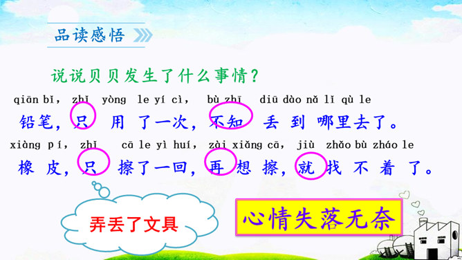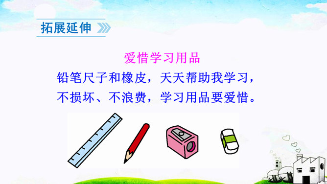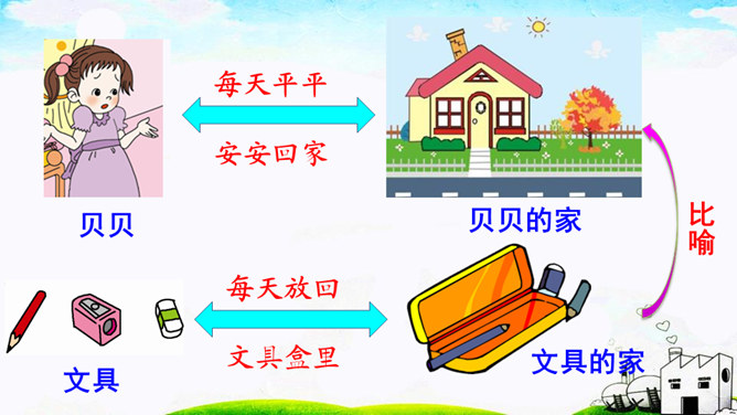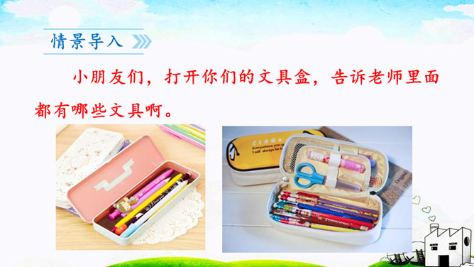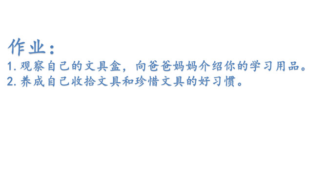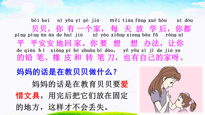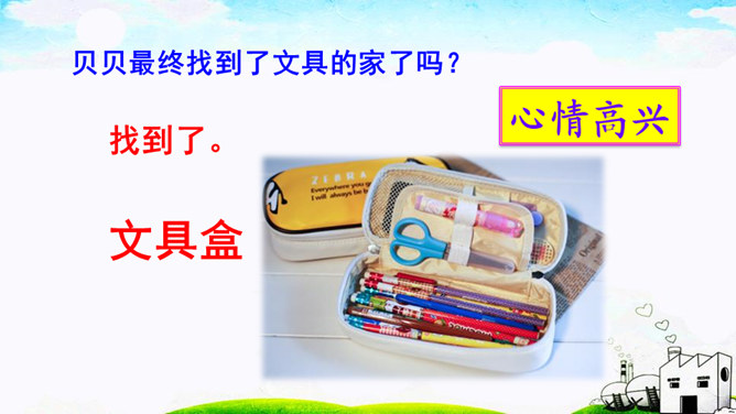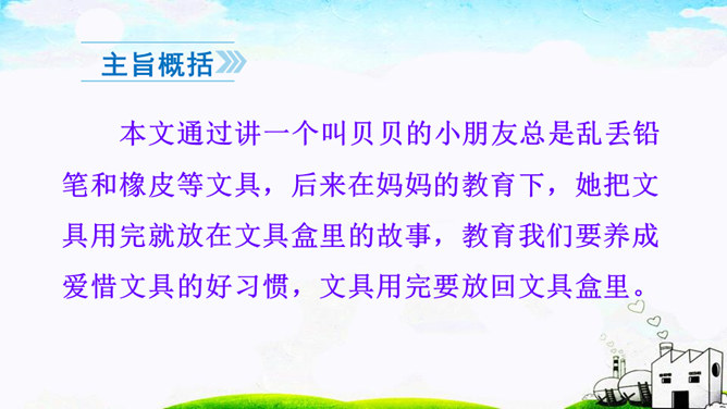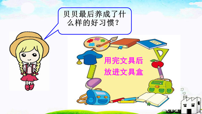 本文通过讲一个叫贝贝的小朋友总是乱丢铅笔和橡皮等文具,后来在妈妈的教育下,她把文具用完就放在文具盒里的故事,教育我们要养成爱惜文具的好习惯,文具用完要放回文具盒里。作业:1.观察自己的文具盒,向爸爸妈妈介绍你的学习用品。2.养成自己收拾文具和珍惜文具的好习惯。贝贝最后养成了什么样的好习惯?妈妈的话是在教贝贝做什么?妈妈的话是在教育贝贝要爱惜文具,用完后把它们放在固定的地方,这样才不会丢失。所属专题:文具的家ppt。