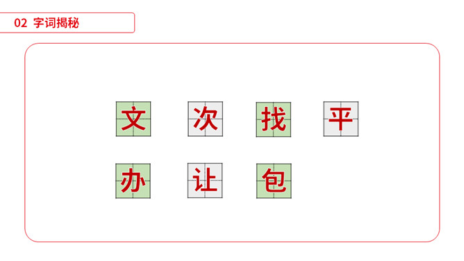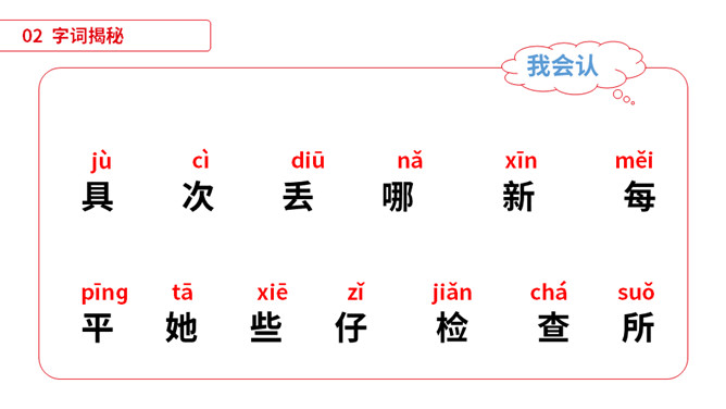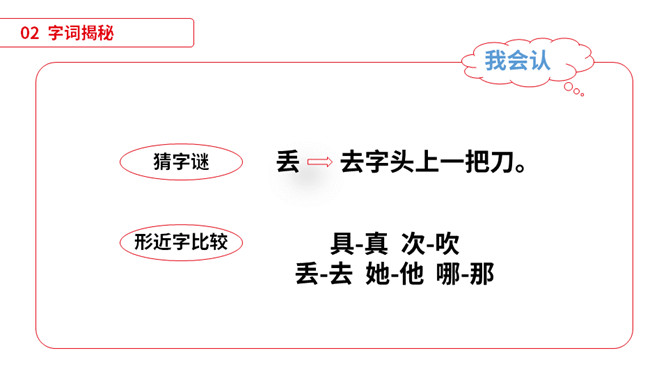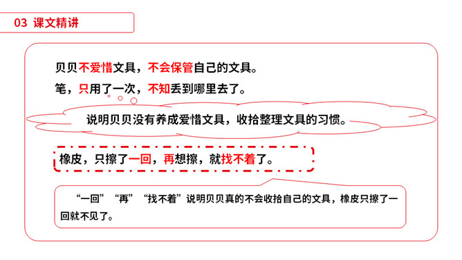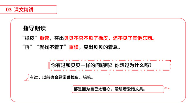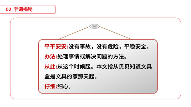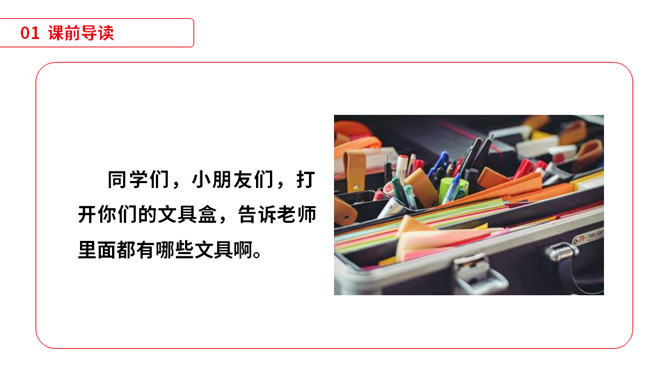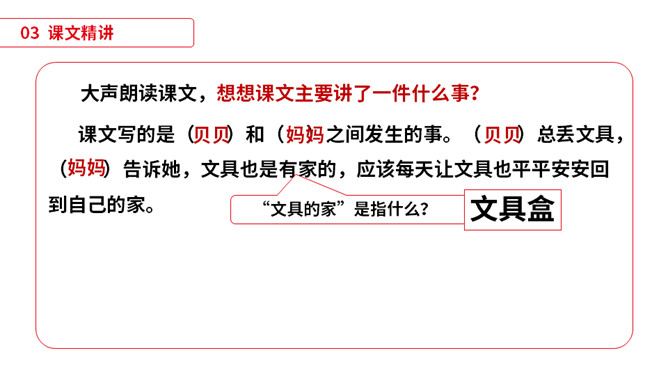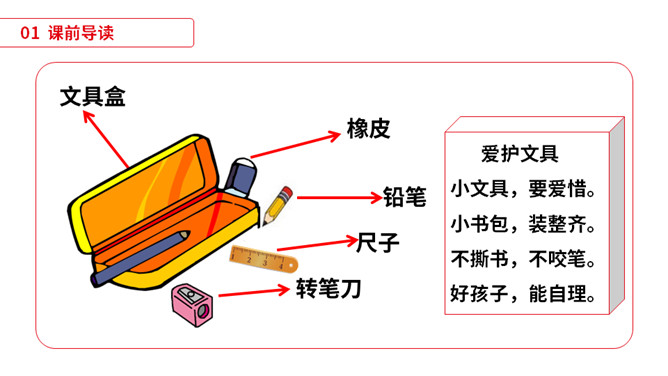 同学们,小朋友们,打开你们的文具盒,告诉老师里面都有哪些文具啊。1)不认识的字可以看拼音,或者请教老师和同学。(2)读准每一个字的字音,圈出生字词;(3)读通每个句子,读不通顺的多读几遍;(4)给每个自然段写上序号。平平安安:没有事故,没有危险,平稳安全。办法:处理事情或解决问题的方法。从此:从这个时候起。本文指从贝贝知道文具盒是文具的家那天起。仔细:细心。本文写的是一个名叫贝贝的小朋友,因为粗心大意,不爱惜自己的文具,在妈妈的帮助下,改掉了粗心的毛病,每天都自己检查书包,变成了一个爱惜文具的好孩子的故事。所属专题:文具的家ppt。