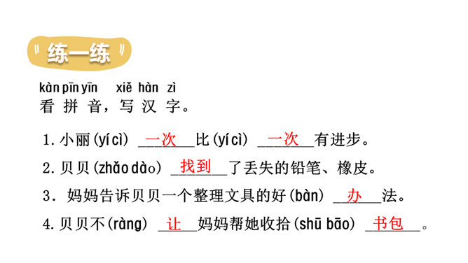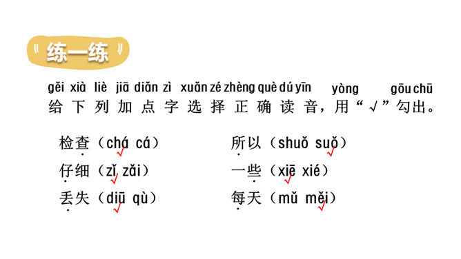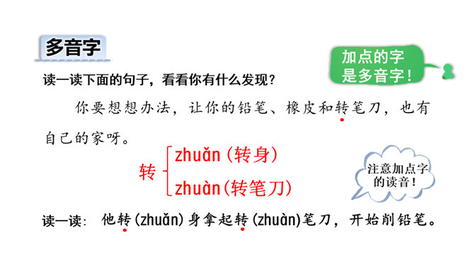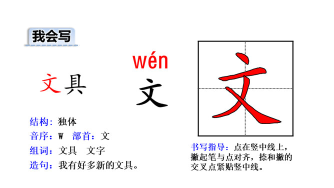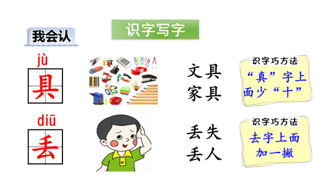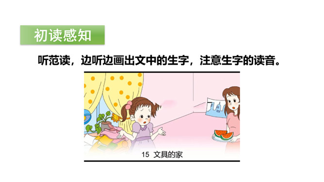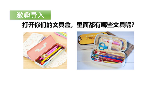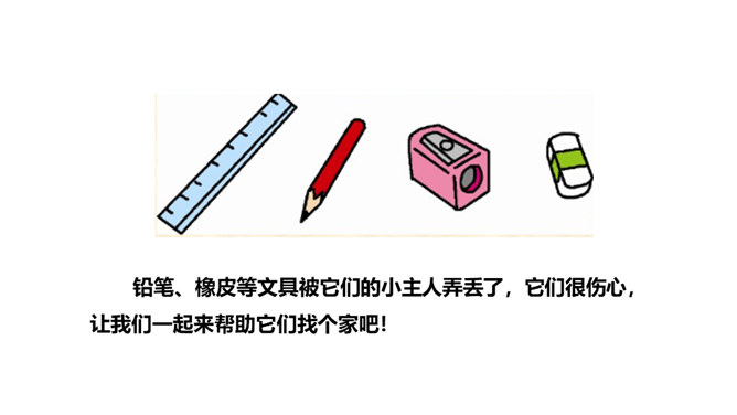 打开你们的文具盒,里面都有哪些文具呢?铅笔、橡皮等文具被它们的小主人弄丢了,它们很伤心,让我们一起来帮助它们找个家吧!听范读,边听边画出文中的生字,注意生字的读音。读一读下面的句子,看看你有什么发现?初读课文后,你感受到了什么?示例:初读课文后,我感受到了我们要爱惜文具,学会整理文具。所属专题:文具的家ppt。