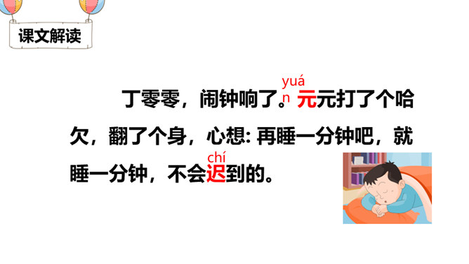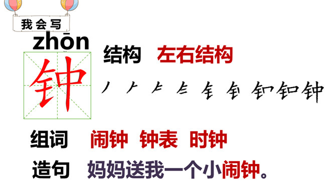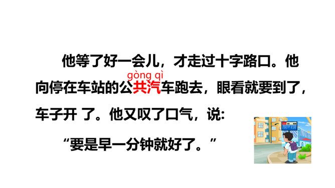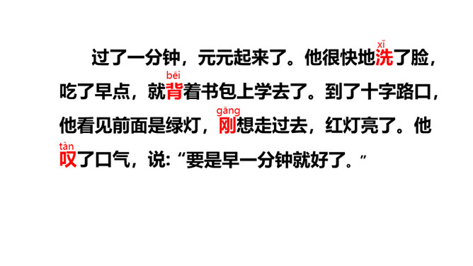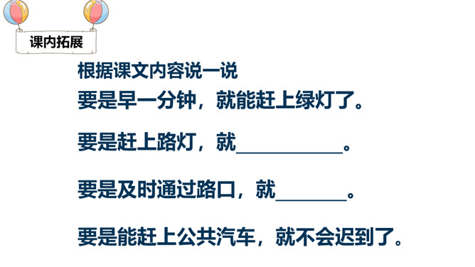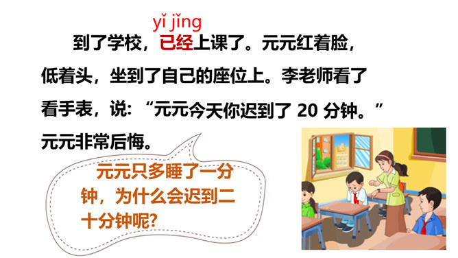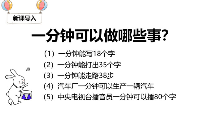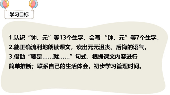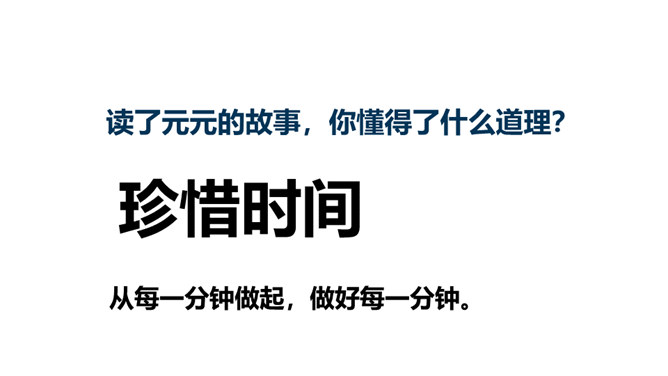 一分钟可以做哪些事?1)一分钟能写18个字(2)一分钟能打出35个字(3)一分钟能走路38步(4)汽车厂一分钟可以生产一辆汽车(5)中央电视台播音员一分钟可以播80个字1.认识“钟、元”等13个生字,会写 “钟、元”等7个生字。2.能正确流利地朗读课文,读出元元沮丧、后悔的语气。3.借助“要是……就……”句式,根据课文内容进行简单推断;联系自己的生活体会,初步学习管理时间。听朗读,然后自己试着读一读,注意读准字音,不会的字多读几遍!所属专题:一分钟ppt。