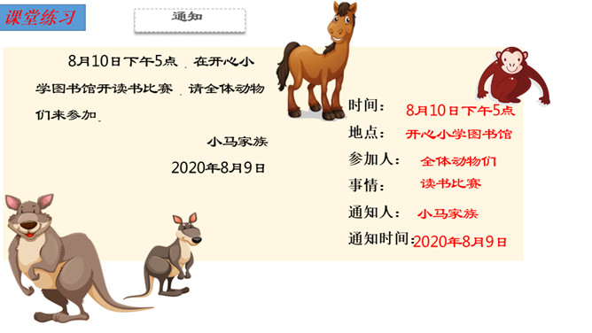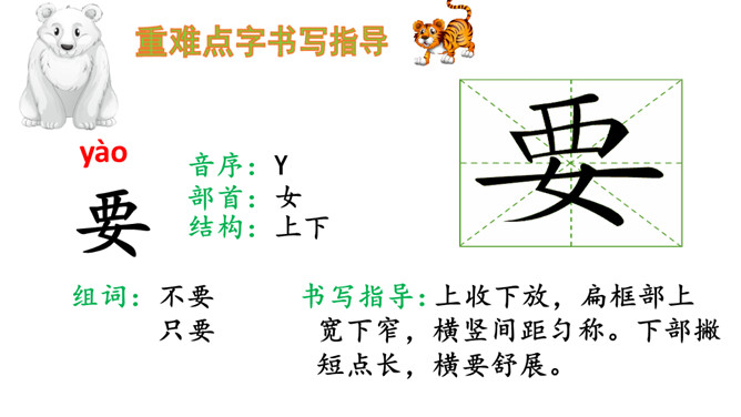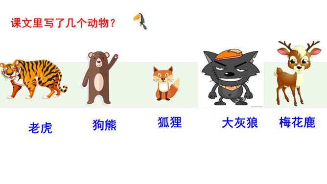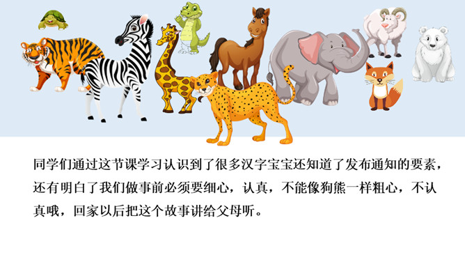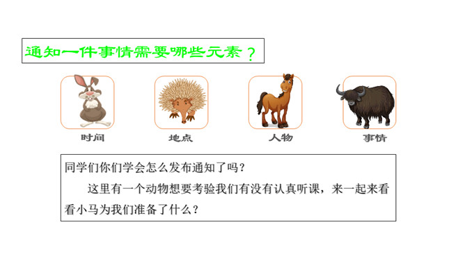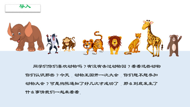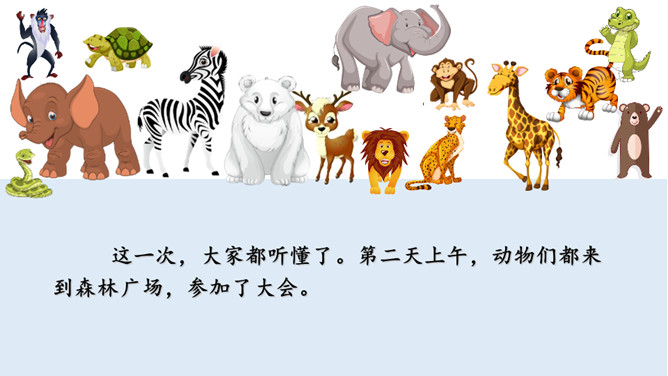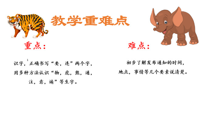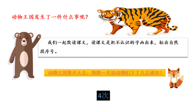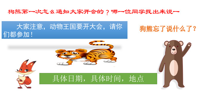 识字,正确书写“要,连”两个字,用多种方法认识“物,虎,熊,通,注,意,遍”等生字。初步了解发布通知的时间,地点,事情等几个要素说清楚。同学们你们喜欢动物吗?有没有去过动物园?看看这些动物你们认识那些?今天,动物王国开一次大会,你们想不想参加动物大会?可是狗熊通知了好几次才成功了,那么到底发生了什么事情我们一起来看看。我们一起默读课文,读课文是把不认识的字画出来,标出自然段序号。动物王国要开大会,狗熊一共给动物们下了几次通知?所属专题:动物王国开大会ppt。