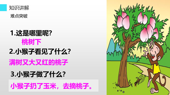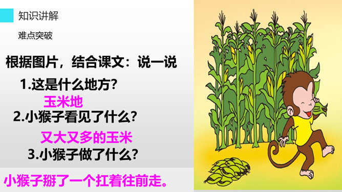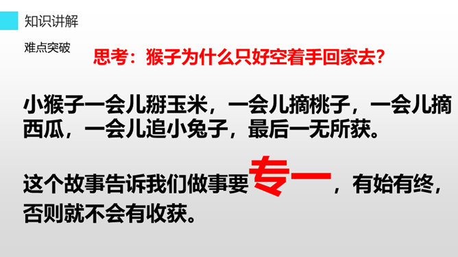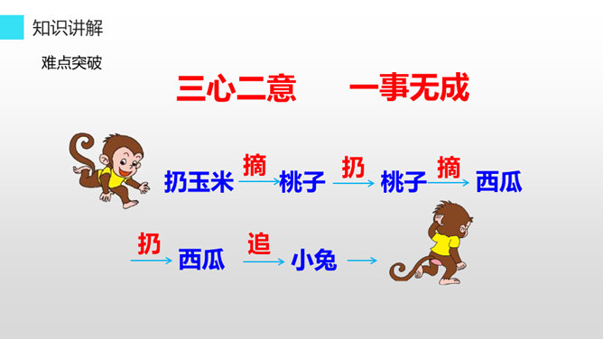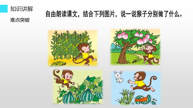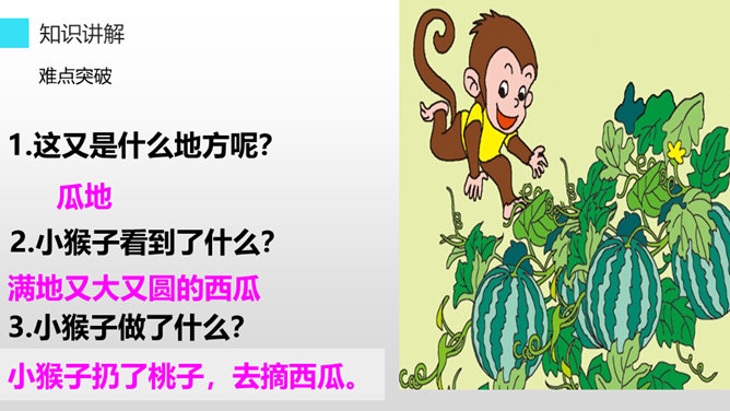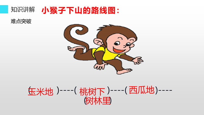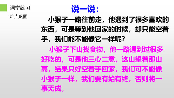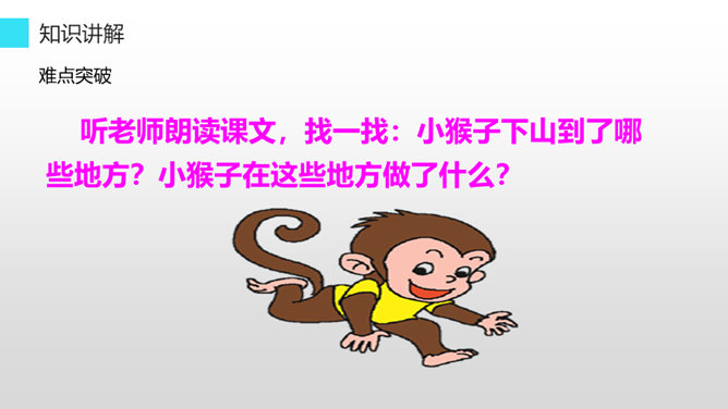 听老师朗读课文,找一找:小猴子下山到了哪些地方?小猴子在这些地方做了什么?小猴子一路往前走,他遇到了很多喜欢的东西,可是等到他回家的时候,却只能空着手,我们能不能像它一样呢?小猴子下山找食物,他一路遇到过很多好吃的,可是他三心二意,这山望着那山高,结果只好空着手回家,我们可不能像小猴子一样,我们要有始有终,否则将一事无成。学习了这篇课文,我们要懂得无论做什么事都要有始有终,不能像小猴子那样,做事三心二意的,那样就会一事无成。所属专题:小猴子下山ppt。