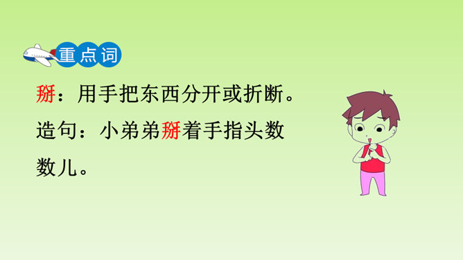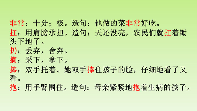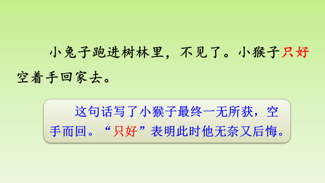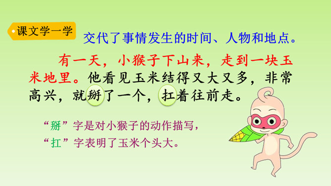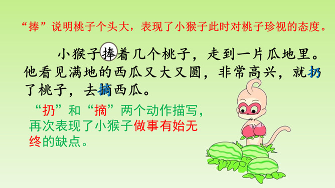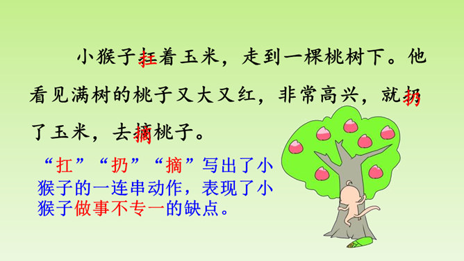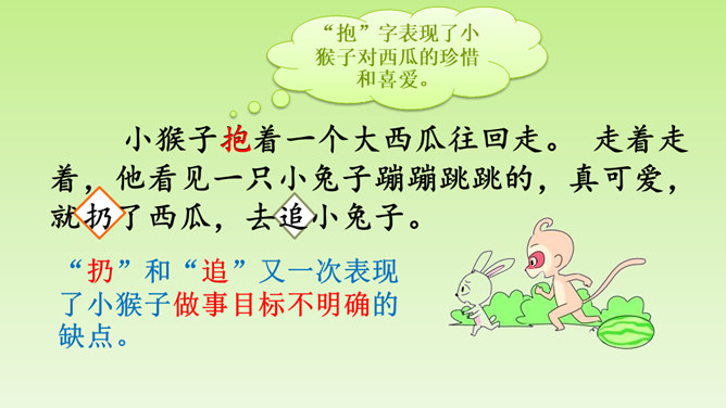 “掰”字是对小猴子的动作描写,“扛”字表明了玉米个头大。“扛”“扔”“摘”写出了小猴子的一连串动作,表现了小猴子做事不专一的缺点。“扔”和“摘”两个动作描写,再次表现了小猴子做事有始无终的缺点。“扔”和“追”又一次表现了小猴子做事目标不明确的缺点。这句话写了小猴子最终一无所获,空手而回。“只好”表明此时他无奈又后悔。这篇童话通过对小猴子下山经过的描写,告诉我们做任何事情都要明确目标、始终如一的道理。所属专题:小猴子下山ppt。