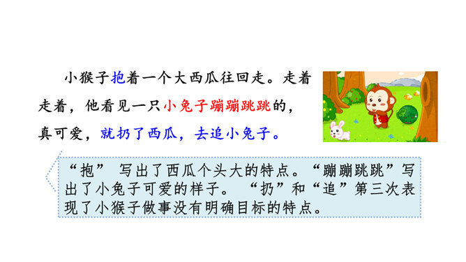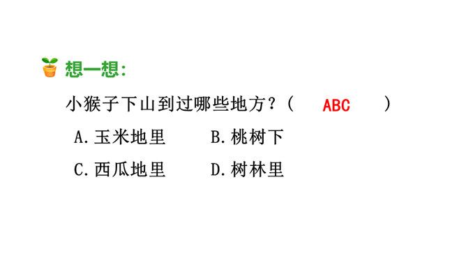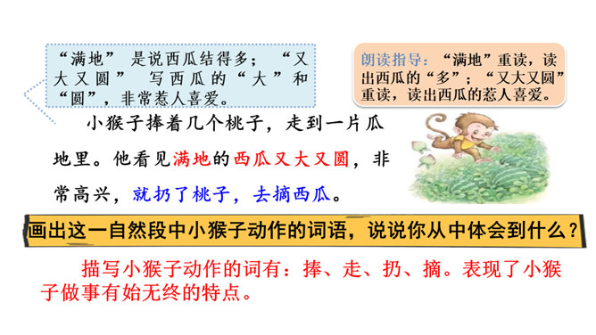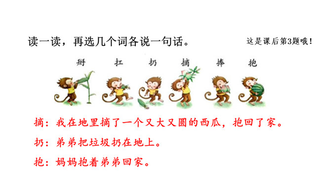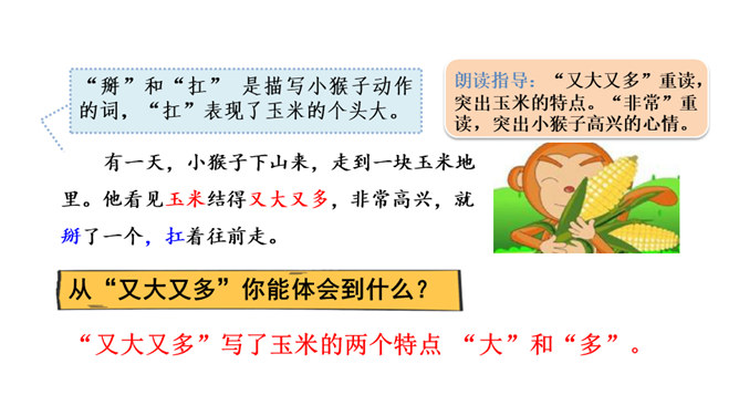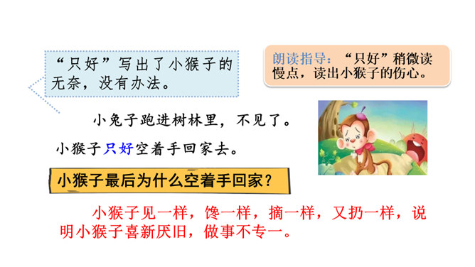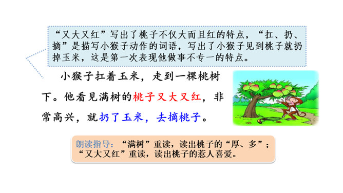 “又大又红”写出了桃子不仅大而且红的特点,“扛、扔、摘”是描写小猴子动作的词语,写出了小猴子见到桃子就扔掉玉米,这是第一次表现他做事不专一的特点。朗读指导:“满树”重读,读出桃子的“厚、多”;“又大又红”重读,读出桃子的惹人喜爱。 示例:开始选择了《白雪公主》,可是见有的小朋友选择了《阿凡提的故事》很有趣,我想我不能示弱,重新选择了《故事大王》中的一个趣味故事,看起来很有意思,可是因为前面耽误了很多时间,这个故事我记得不熟练,练习也不够,最后比赛时我卡壳了,成绩很不理想。所属专题:小猴子下山ppt。