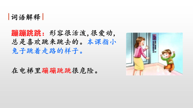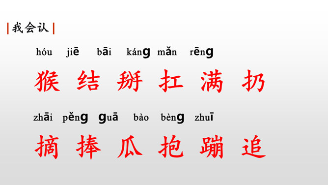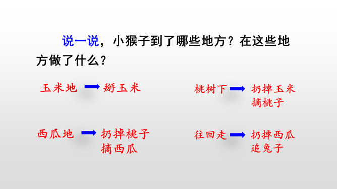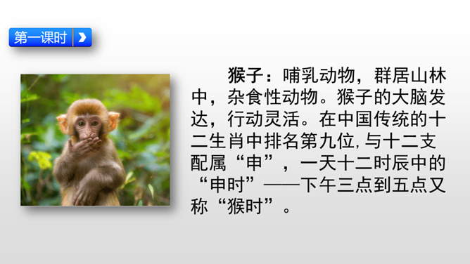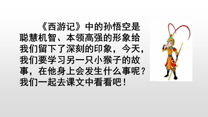 《西游记》中的孙悟空是聪慧机智、本领高强的形象给我们留下了深刻的印象,今天,我们要学习另一只小猴子的故事,在他身上会发生什么事呢?我们一起去课文中看看吧!请同学们自由读课文,一边读,一边圈画出课后的生字。上节课我们学习了字词。下面我就开始仔细阅读小猴子的故事,明确这个故事告诉我们的道理吧!结合插图,说说小猴子看到了什么,做了什么,最后为什么只好空着手回家去。小猴子追到兔子了吗?最后又带了什么回去呢?所属专题:小猴子下山ppt。