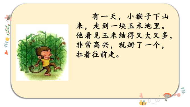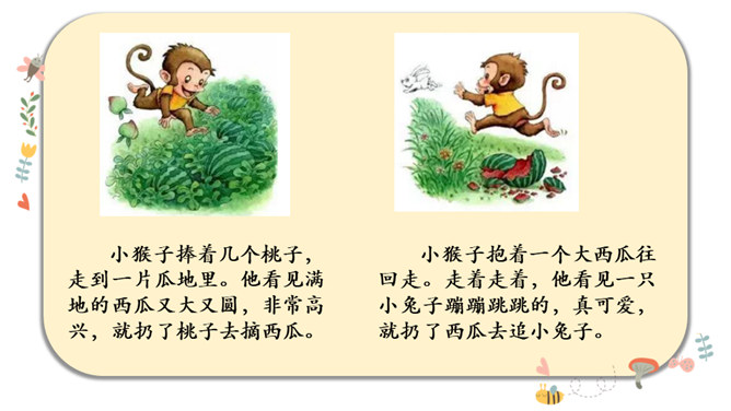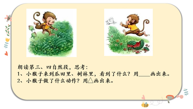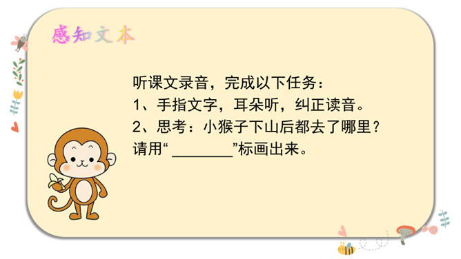 听课文录音,完成以下任务:1、手指文字,耳朵听,纠正读音。2、思考:小猴子下山后都去了哪里?朗读第三、四自然段,思考:1、小猴子来到瓜田里、树林里,看到了什么?用____画出来。2、小猴子做了什么动作?用 画出来。过了一个星期,小猴子又下山了。这次,它又去了哪里?看到了什么?做了什么?你来编一个故事《新小猴子下山》。所属专题:小猴子下山ppt。