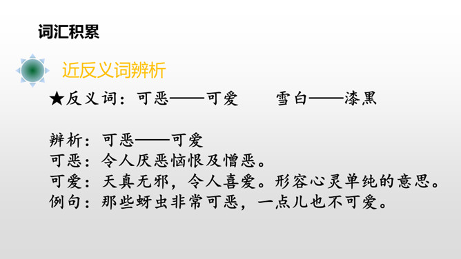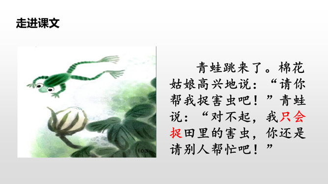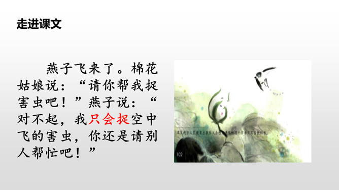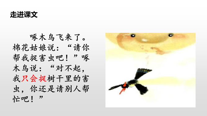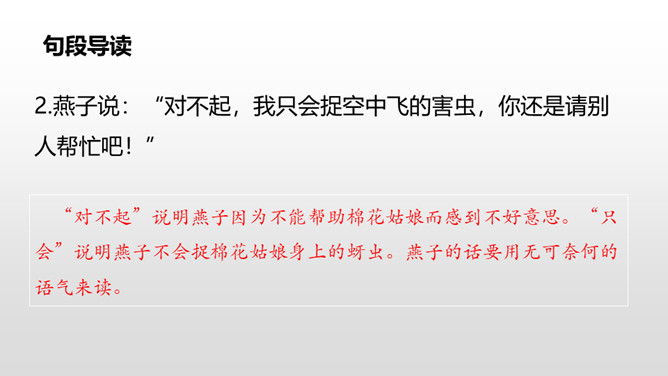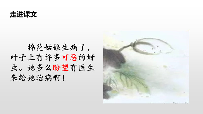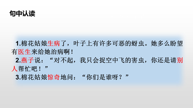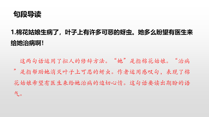 这两句话运用了拟人的修辞方法。“她”是指棉花姑娘。“治病”是指帮助她消灭叶子上可恶的蚜虫。作者运用感叹句,表现了棉花姑娘希望有医生来给她治病的迫切心情。这句话要读出期盼的语气。“对不起”说明燕子因为不能帮助棉花姑娘而感到不好意思。“只会”说明燕子不会捉棉花姑娘身上的蚜虫。燕子的话要用无可奈何的语气来读。棉花姑娘对吃掉自己身上害虫的这群小虫感到陌生,因此很惊奇。我们要用惊奇的语气读棉花姑娘的话。所属专题:棉花姑娘ppt。