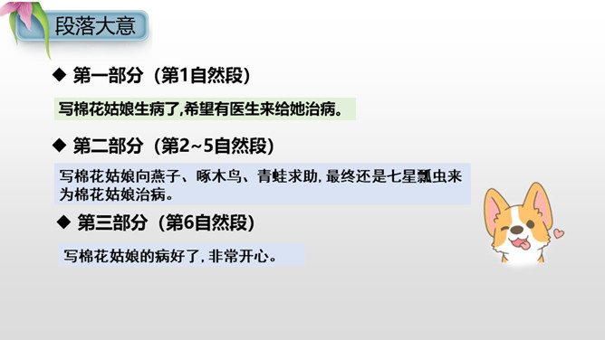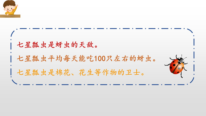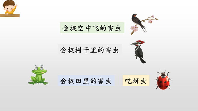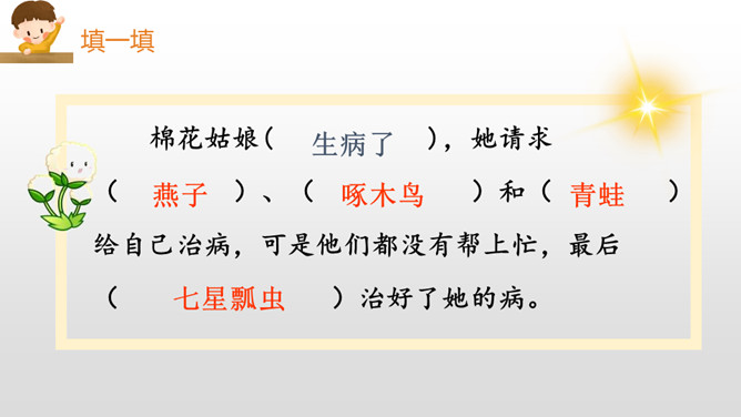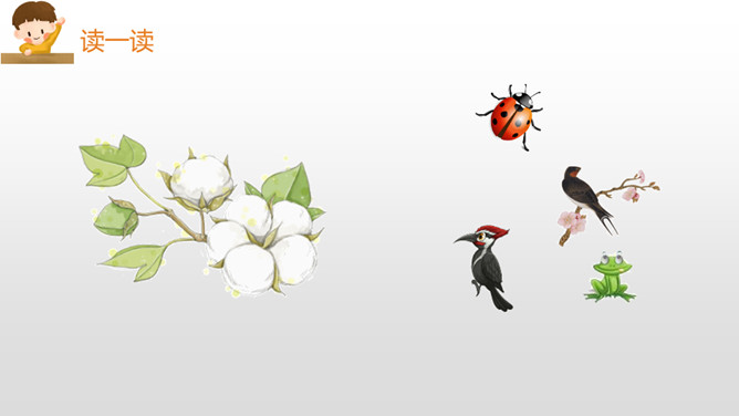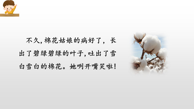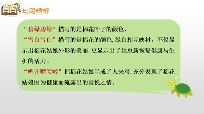 “碧绿碧绿”描写的是棉花叶子的颜色,“雪白雪白”描写的是棉花的颜色,绿白相互映衬,不仅显示出棉花姑娘外形的美丽,更显示出了她重新恢复健康与生机的活力。“咧开嘴笑啦”把棉花姑娘当成了人来写,充分表现了棉花姑娘因为健康而流露出的喜悦之情。小朋友们,学习了这篇课文,我们认识了燕子、啄木鸟、青蛙、七星瓢虫这些益鸟和益虫,它们本领高强,专吃害虫,是植物和庄稼的保护神呢!希望小朋友们多多了解它们,爱护它们,让它们真正成为我们人类的好朋友。所属专题:棉花姑娘ppt。