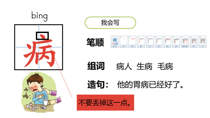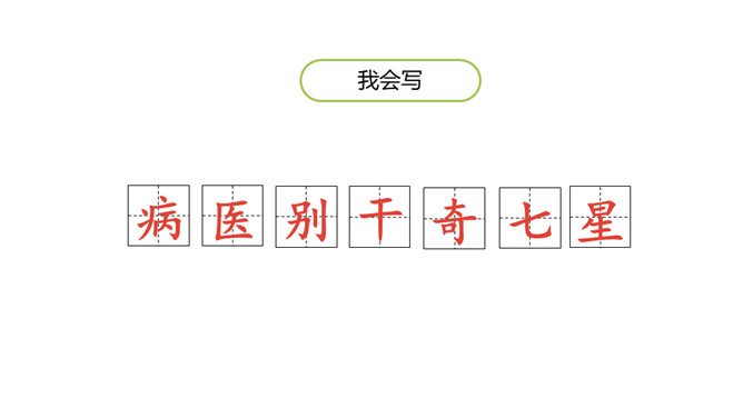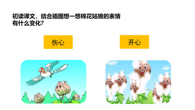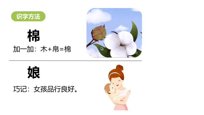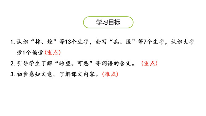 1.认识“棉、娘”等13个生字,会写“病、医”等7个生字,认识大字旁1个偏旁(重点)2.引导学生了解“盼望、可恶”等词语的含义。 (重点)3.初步感知文意,了解课文内容。(难点)同学们,今天老师为你们带来了一位新朋友,看看她是谁呀?碧绿:形容浓绿色。造句:春天,碧绿的田野花儿朵朵。惊奇:惊讶奇怪。造句:这里的变化之大,令人惊奇。初读课文,结合插图想一想棉花姑娘的表情有什么变化?所属专题:棉花姑娘ppt。