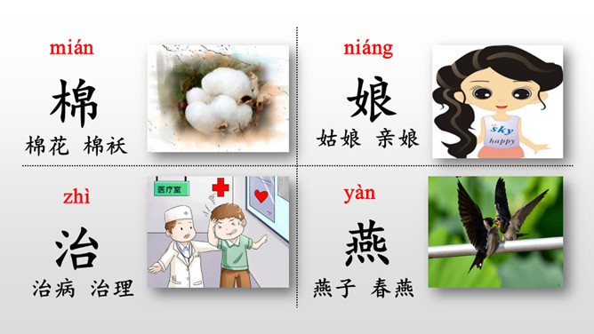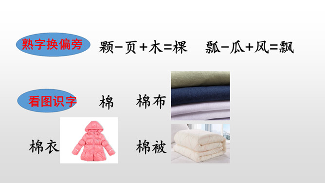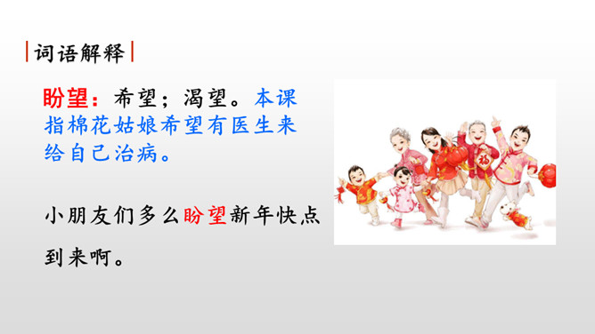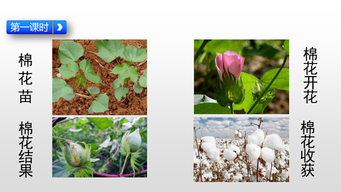 1.交流台:我们的好朋友。通过查阅资料或向别人请教,继续寻找益鸟或益虫,用图片或文字的形式做好记录。2.借助材料,创编对话。请你模仿第2-4自然段对话的形式,编一组或几组对话。想一想,棉花姑娘还可能遇见谁呢?他们之间会发生怎么样的对话呢?大家一起说一说,演一演。这句话在文中共出现了三次,要读出棉花姑娘的急切之情,读出请求、盼望的语气。随着故事情节的发展,棉花姑娘说话的心情和语气要变得更为急切。所属专题:棉花姑娘ppt。