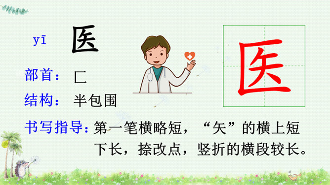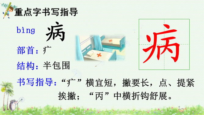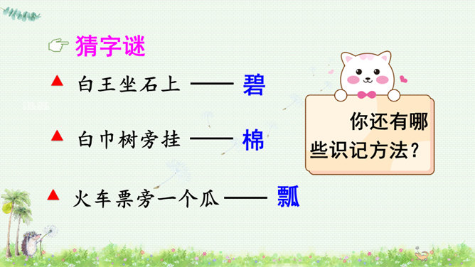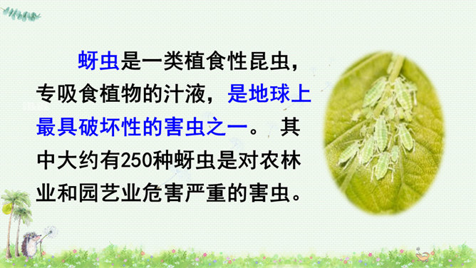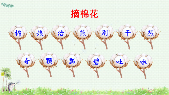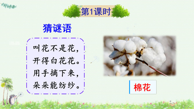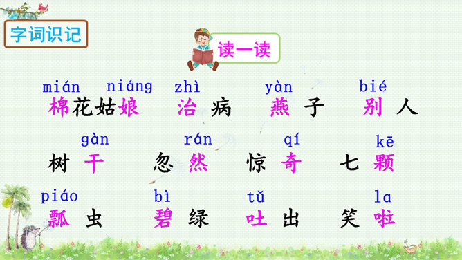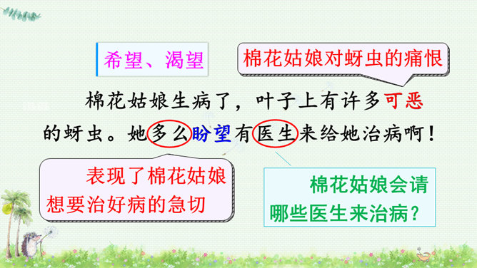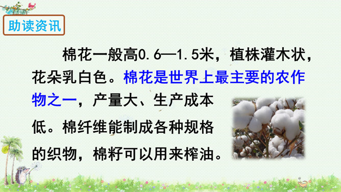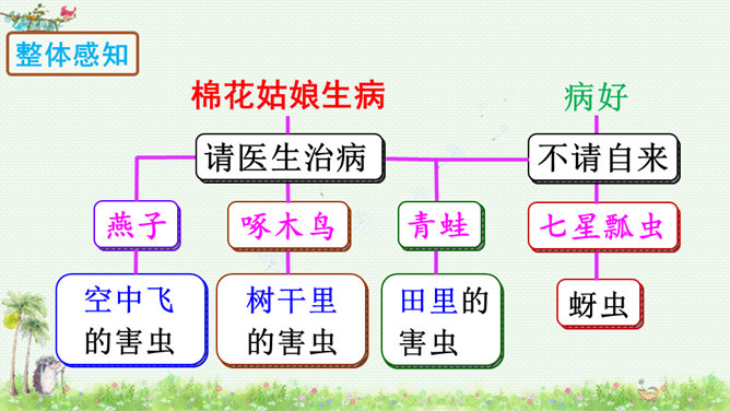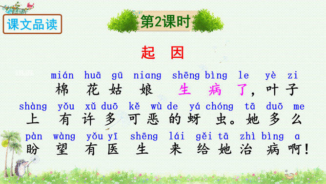朗读课文,读好课文中的对话。朗读指导:棉花姑娘的话是个表示请求的祈使句,与表示命令的祈使句相比,它的语气更舒缓一些。棉花姑娘的请求在文中一共出现了三次,随着棉花姑娘病情的加重,语气应该一次比一次急切“请、帮、捉害虫”要重读。燕子、啄木鸟、青蛙心有余而力不足,所以他们的回答要读得有礼貌。“对不起、只会、请”要略重读。1.朗读课文;正确书写本课生字。2.查阅资料或向他人请教,继续寻找益鸟和益虫,用图片或文字的形式做好记录,全班交流。所属专题:棉花姑娘ppt。