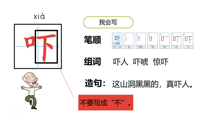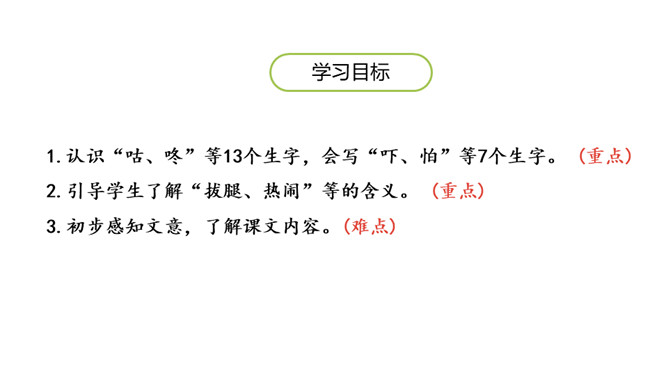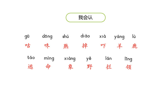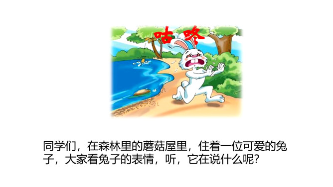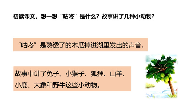 1.认识“咕、咚”等13个生字,会写“吓、怕”等7个生字。 (重点)2.引导学生了解“拔腿、热闹”等的含义。 (重点)3.初步感知文意,了解课文内容。(难点)同学们,在森林里的蘑菇屋里,住着一位可爱的兔子,大家看兔子的表情,听,它在说什么呢?初读课文,想一想“咕咚”是什么?故事讲了几种小动物?“咕咚”是熟透了的木瓜掉进湖里发出的声音。故事中讲了兔子、小猴子、狐狸、山羊、小鹿、大象和野牛这些小动物。所属专题:咕咚ppt。