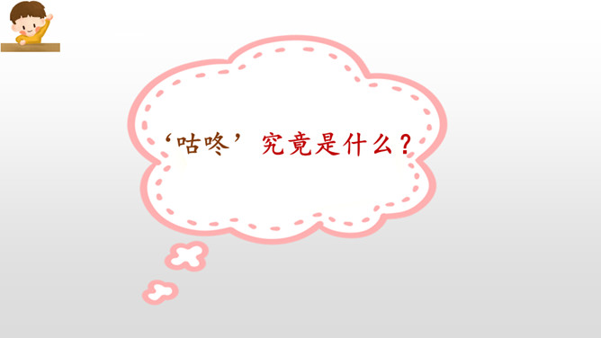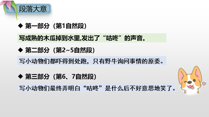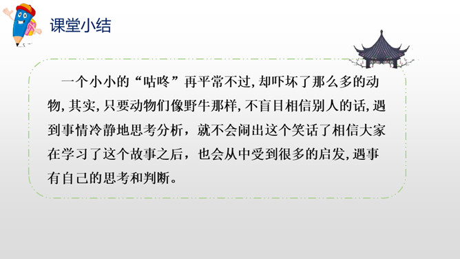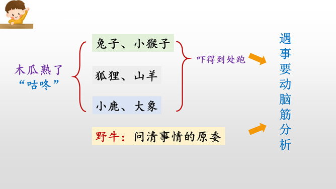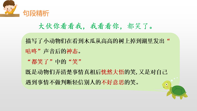 描写了小动物们在看到木瓜从高高的树上掉到湖里发出“咕咚”声音后的神态。“都笑了”中的“笑”既是动物们弄清楚事情真相后恍然大悟的笑,又是对自己遇到事情不做判断轻信别人的不好意思的笑。一个小小的“咕咚”再平常不过,却吓坏了那么多的动物,其实,只要动物们像野牛那样,不盲目相信别人的话,遇到事情冷静地思考分析,就不会闹出这个笑话了相信大家在学习了这个故事之后,也会从中受到很多的启发,遇事有自己的思考和判断。所属专题:咕咚ppt。