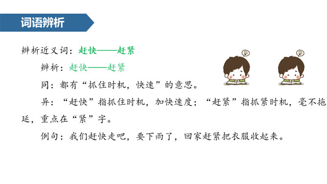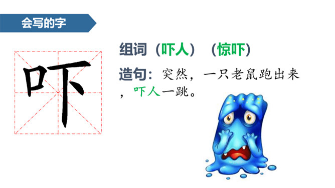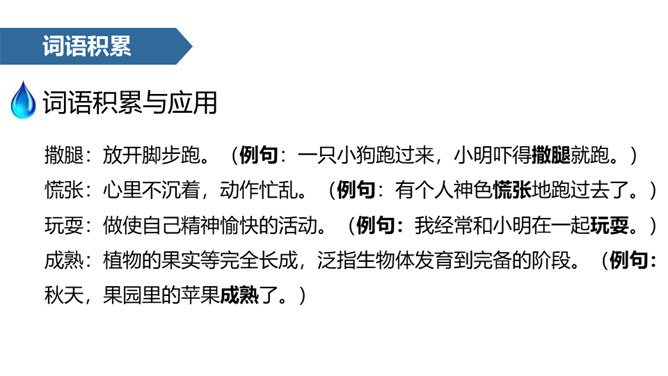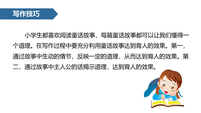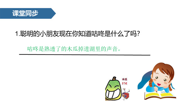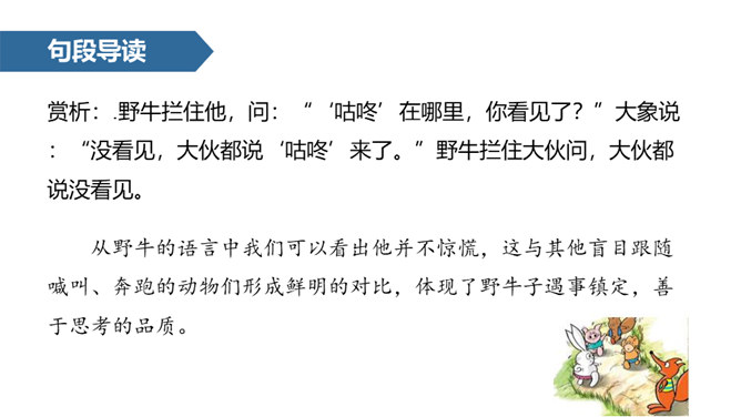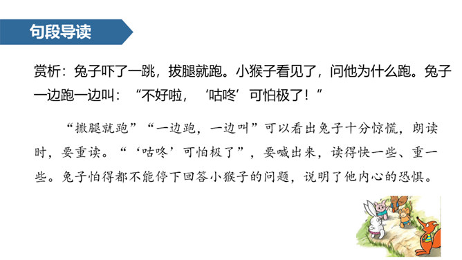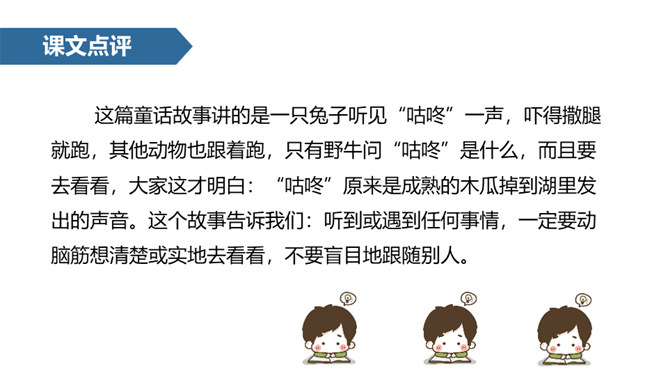 这篇童话故事讲的是一只兔子听见“咕咚”一声,吓得撒腿就跑,其他动物也跟着跑,只有野牛问“咕咚”是什么,而且要去看看,大家这才明白:“咕咚”原来是成熟的木瓜掉到湖里发出的声音。这个故事告诉我们:听到或遇到任何事情,一定要动脑筋想清楚或实地去看看,不要盲目地跟随别人。小学生都喜欢阅读童话故事,每篇童话故事都可以让我们懂得一个道理。在写作过程中要充分利用童话故事达到育人的效果。第一,通过故事中生动的情节,反映一定的道理,从而达到育人的效果。第二,通过故事中主人公的话揭示道理,达到育人的效果。所属专题:咕咚ppt。