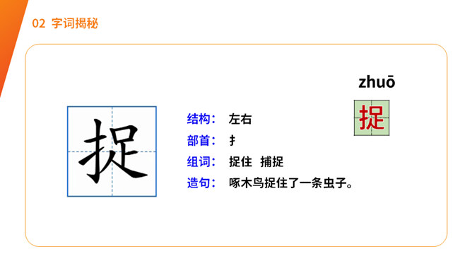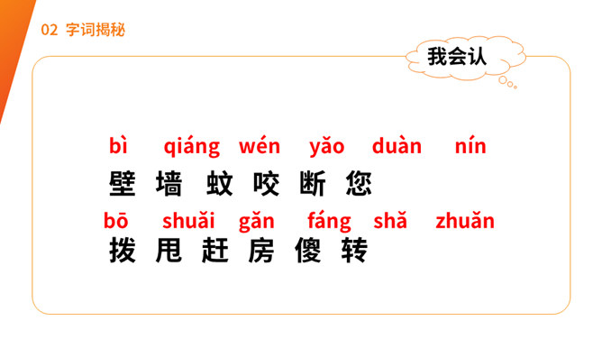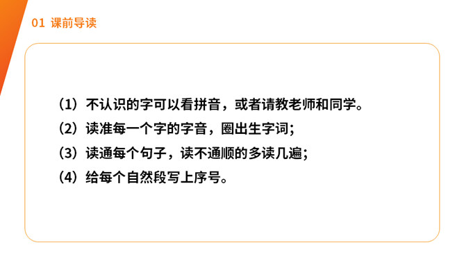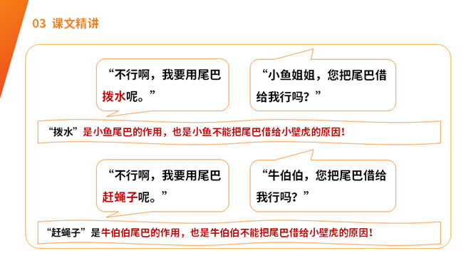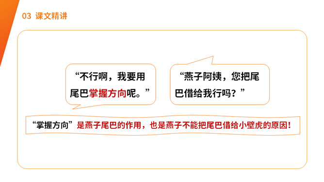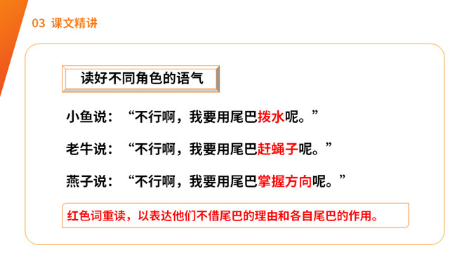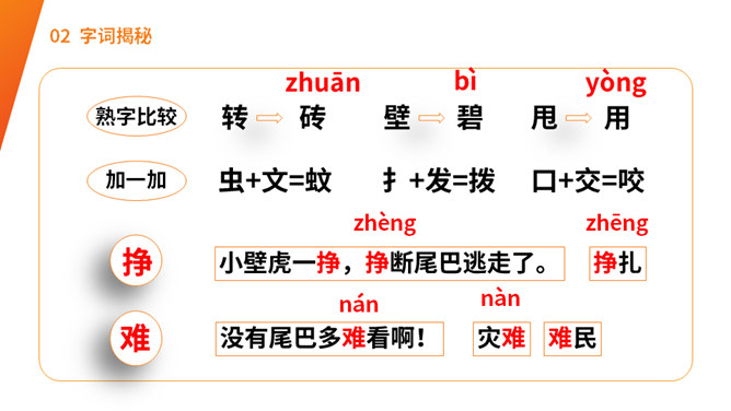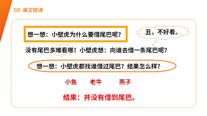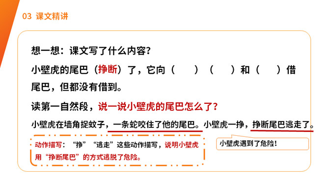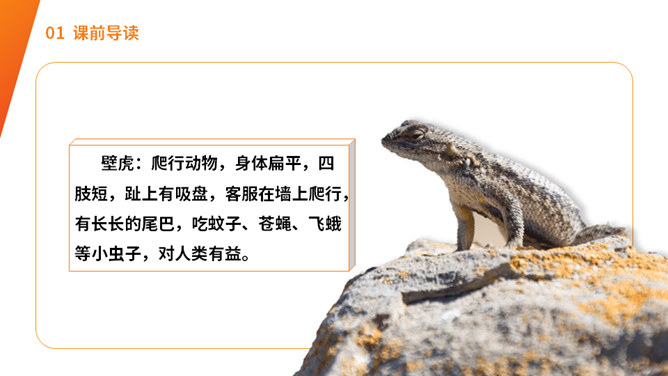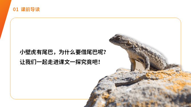 小壁虎有尾巴,为什么要借尾巴呢?让我们一起走进课文一探究竟吧!(1)不认识的字可以看拼音,或者请教老师和同学。(2)读准每一个字的字音,圈出生字词;(3)读通每个句子,读不通顺的多读几遍;(4)给每个自然段写上序号。读第一自然段,说一说小壁虎的尾巴怎么了?动作描写:“挣”“逃走”这些动作描写,说明小壁虎用“挣断尾巴”的方式逃脱了危险。想一想:小壁虎都找谁借过尾巴?结果怎么样?所属专题:小壁虎借尾巴ppt。