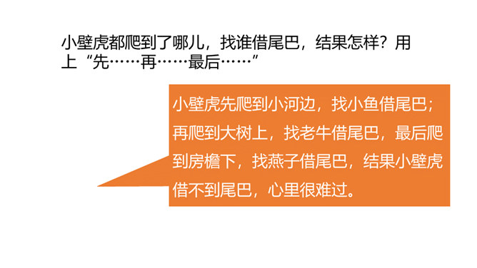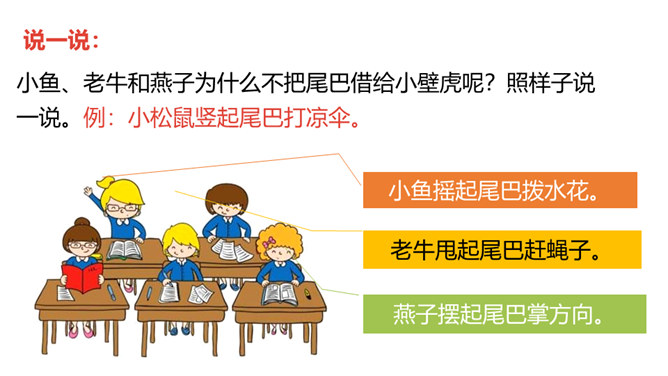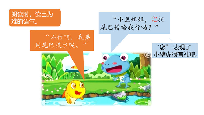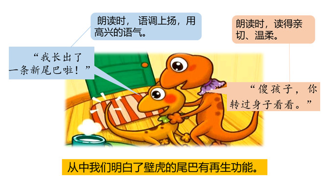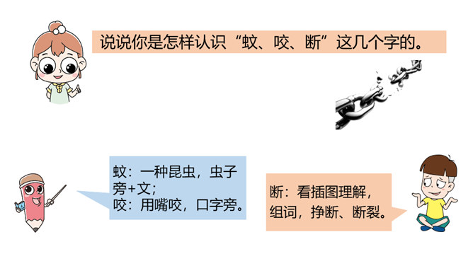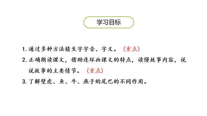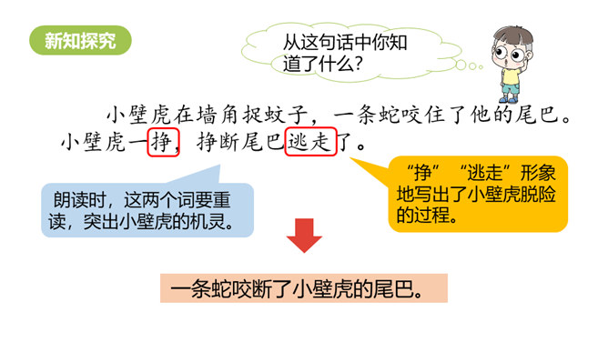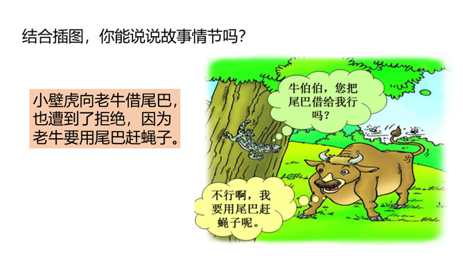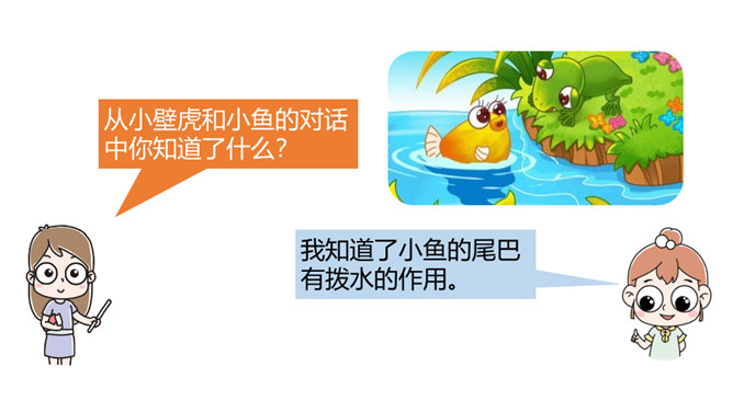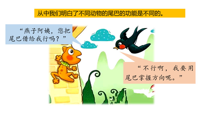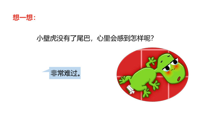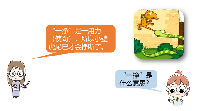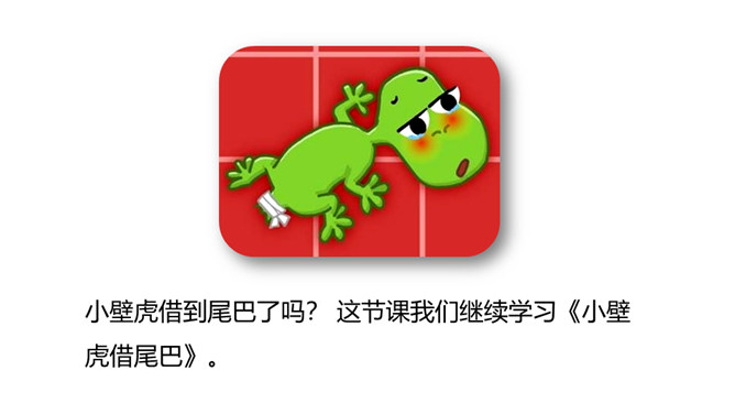 1.通过多种方法猜生字字音、字义。 (重点)2.正确朗读课文,借助连环画课文的特点,读懂故事内容,说说故事的主要情节。 (重点)3.了解壁虎、鱼、牛、燕子的尾巴的不同作用。“挣”“逃走”形象地写出了小壁虎脱险的过程。朗读时,这两个词要重读,突出小壁虎的机灵。“一挣”是一用力(使劲),所以小壁虎尾巴才会挣断了。说说你是怎样认识“蚊、咬、断”这几个字的。小壁虎没有了尾巴,心里会感到怎样呢?非常难过。所属专题:小壁虎借尾巴ppt。