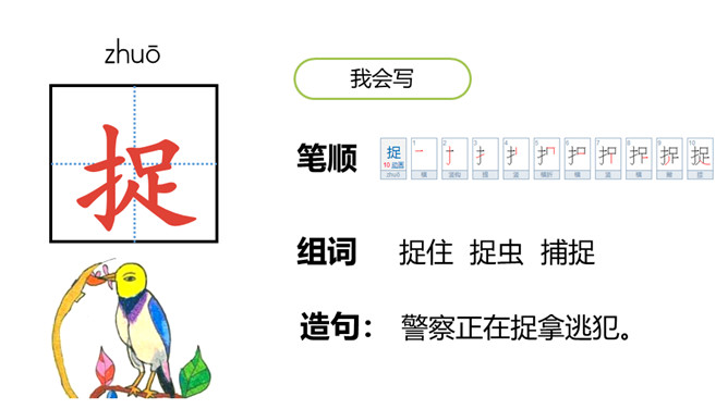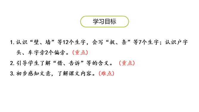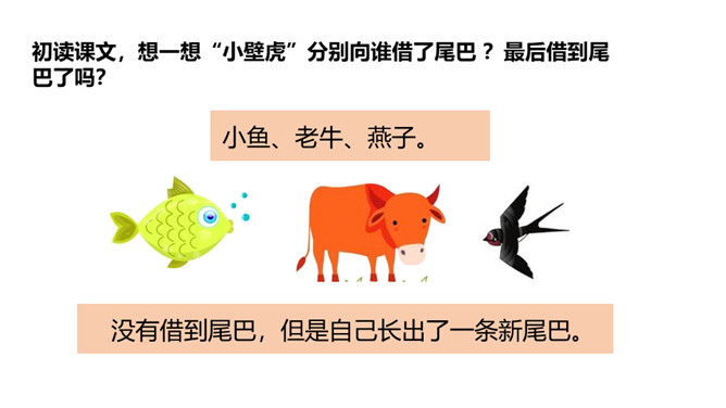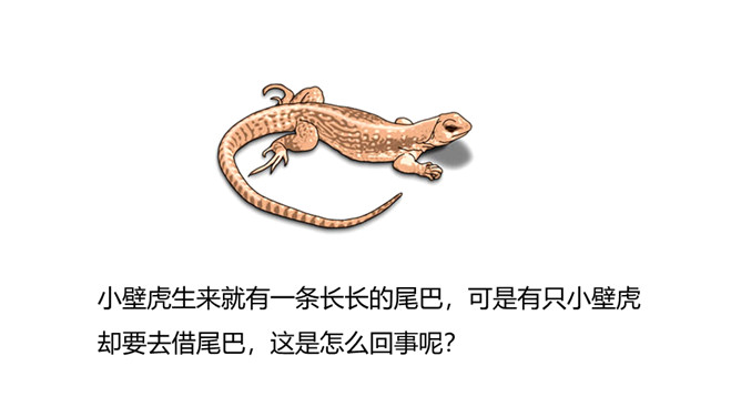 1.认识“壁、墙”等12个生字,会写“捉、条”等7个生字;认识户字头、车字旁2个偏旁。(重点)2.引导学生了解“借、告诉”等的含义。 (重点)3.初步感知文意,了解课文内容。(难点)小壁虎生来就有一条长长的尾巴,可是有只小壁虎却要去借尾巴,这是怎么回事呢?初读课文,想一想“小壁虎”分别向谁借了尾巴 ?最后借到尾巴了吗?没有借到尾巴,但是自己长出了一条新尾巴。所属专题:小壁虎借尾巴ppt。