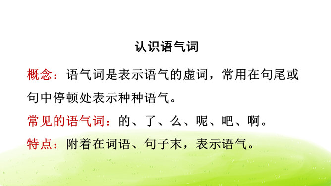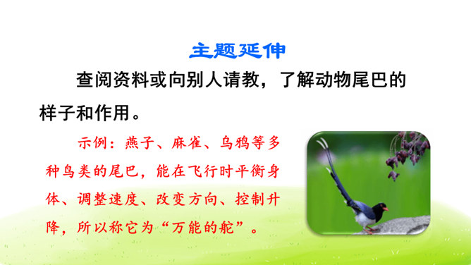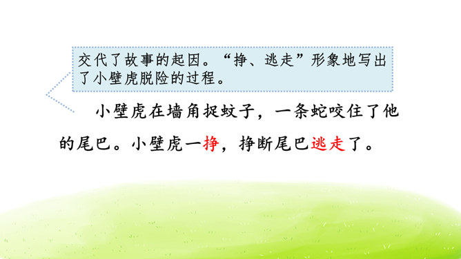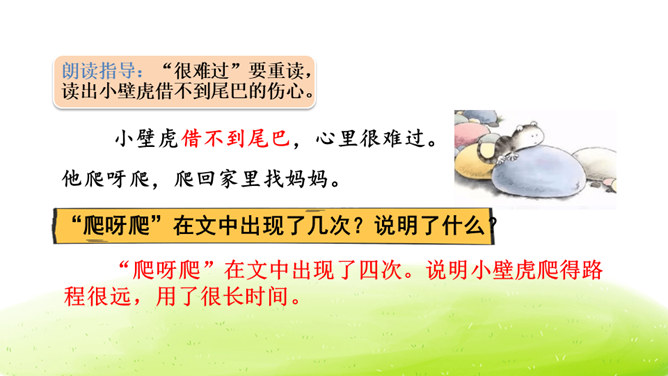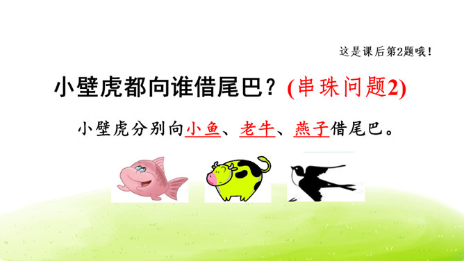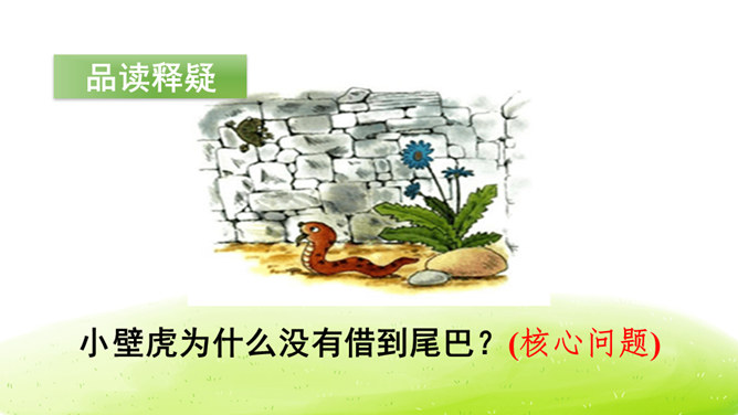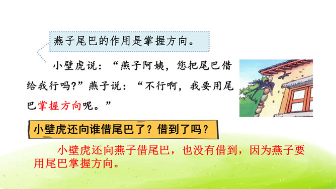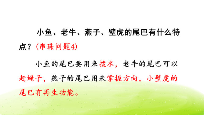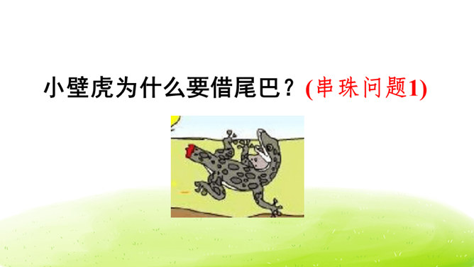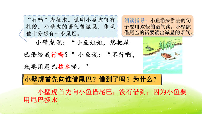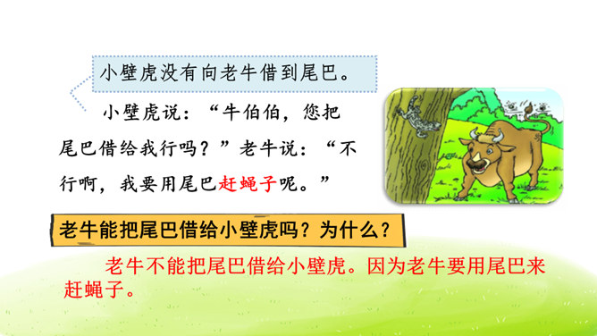 是一篇科普童话,课文借助拟人的手法,通过小壁虎向小鱼、老牛、燕子借尾巴的故事,讲了几种动物尾巴的特点,文章生动有趣,把小动物有礼貌和它们之间真诚相待的美好形象表现得栩栩如生。它通过叙述小壁虎向小鱼、老牛、燕子借尾巴的经过,向我们介绍了鱼、牛、燕子尾巴的用途及壁虎尾巴可以再生的特点,揭示了动物尾巴都有用的道理。写两句话,分别表示高兴和疑问的语气,注意用上语气词。1.妈妈回来了,我太高兴啦!2.妈妈,作业写完了,我可以看一会电视吗?所属专题:小壁虎借尾巴ppt。