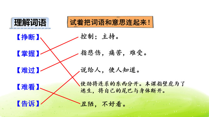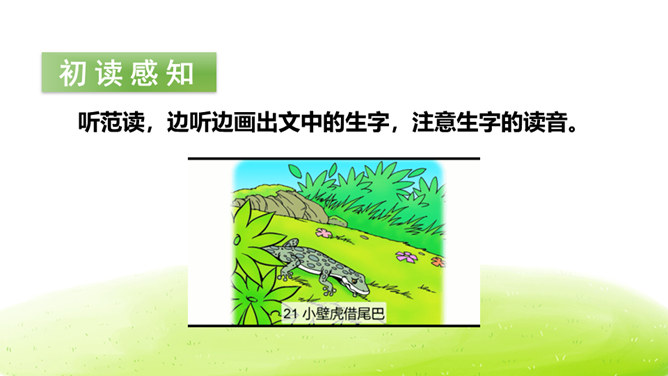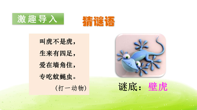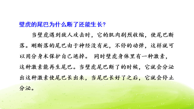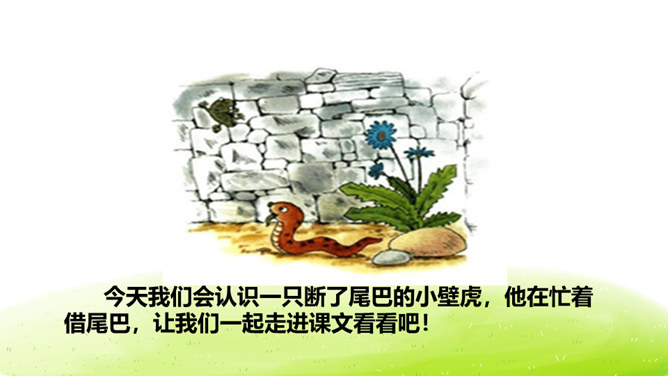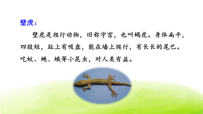 今天我们会认识一只断了尾巴的小壁虎,他在忙着借尾巴,让我们一起走进课文看看吧!壁虎是爬行动物,旧称守宫,也叫蝎虎。身体扁平,四肢短,趾上有吸盘,能在墙上爬行,有长长的尾巴。吃蚊、蝇、蛾等小昆虫,对人类有益。壁虎的尾巴为什么断了还能生长? 当壁虎遇到敌人攻击时,它的肌肉剧烈收缩,使尾巴断落。刚断落的尾巴由于神经没有死,不停的动弹,这样就可以用分身术保护自己逃掉。 同时壁虎身体里有一种激素,这种激素能再生尾巴。当壁虎尾巴断了的时候,它就会分泌出这种激素使尾巴长出来,当尾巴长好了之后,它就会停止分泌。所属专题:小壁虎借尾巴ppt。