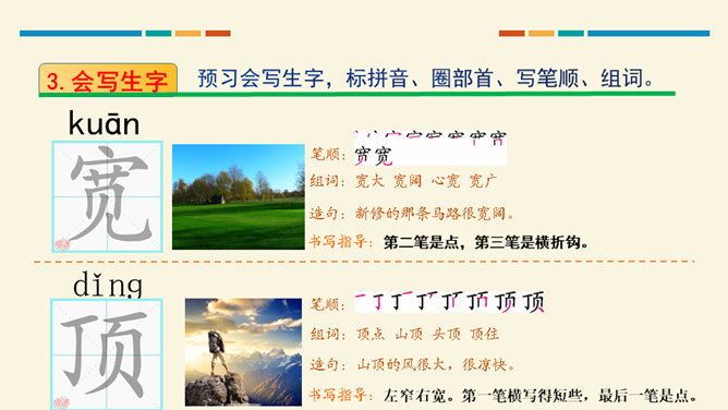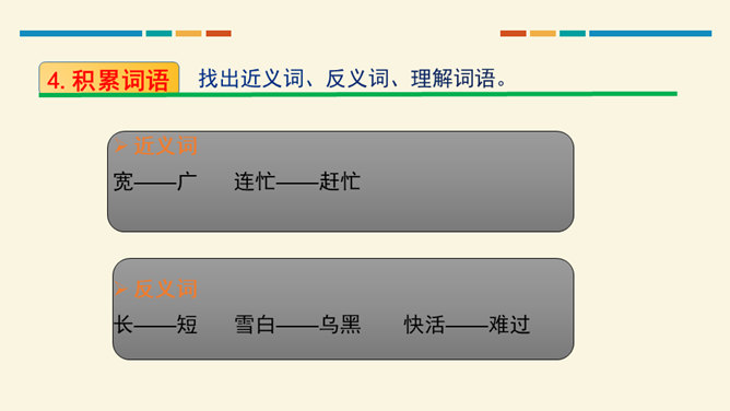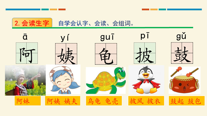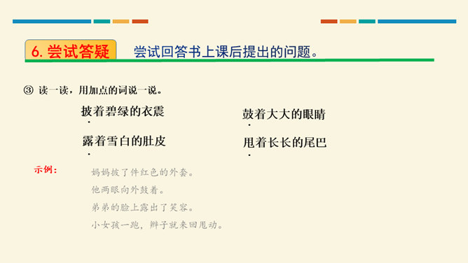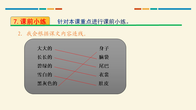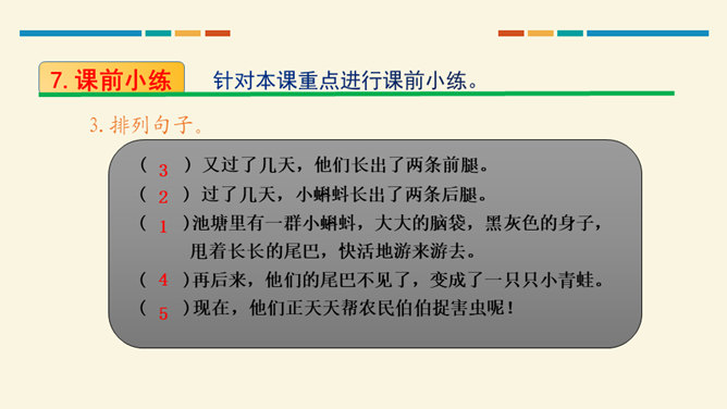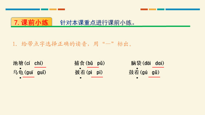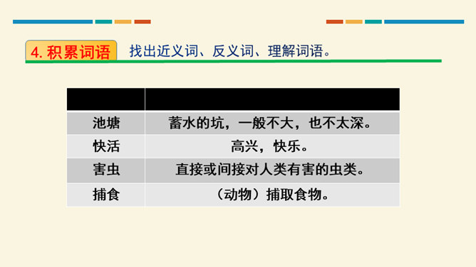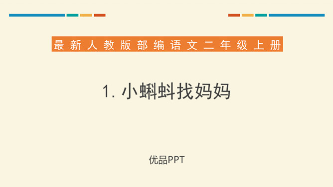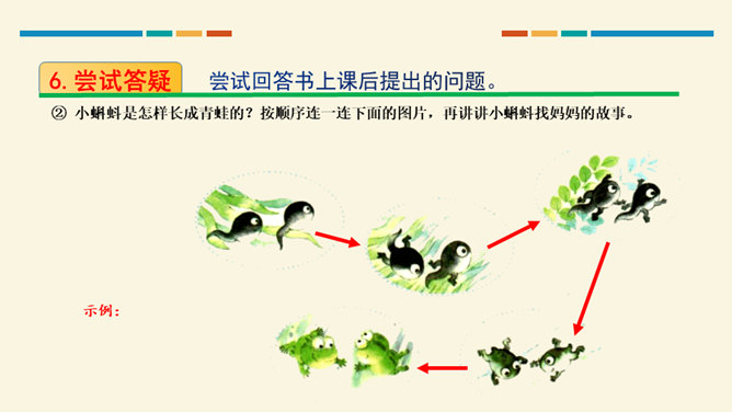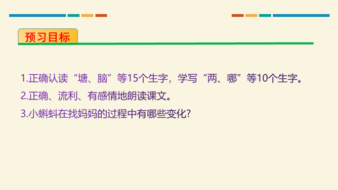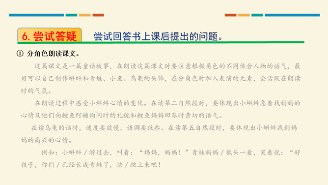这篇课文是一篇童话故事,在朗读这篇课文时要注意根据角色的不同体会人物的语气,最好可以自己制作蝌蚪和青蛙、小鱼、乌龟的头饰,在分角色时加入表演的元素,会活跃在朗读时的气氛。在朗读过程中感受小蝌蚪心情的变化。在读第二自然段时,要体现出小蝌蚪急着找妈妈的心情及他们向鲤鱼阿姨询问时的礼貌和鲤鱼妈妈回答时亲切的语气。在读乌龟的话时,速度要放慢,语调要低些。在读第五自然段时,要体现出小蝌蚪找到妈妈的高兴的心情。所属专题:小蝌蚪找妈妈ppt。