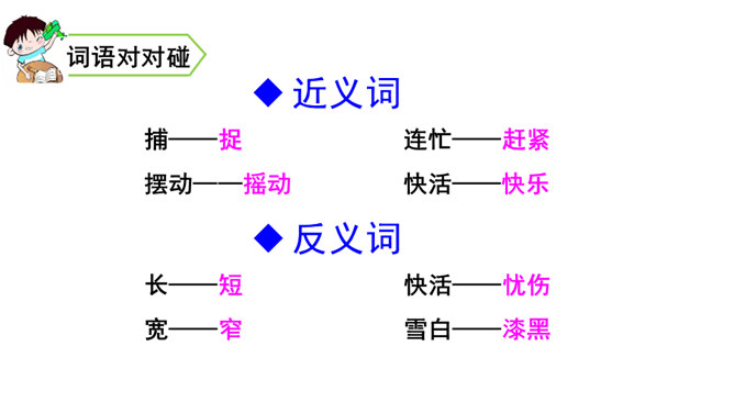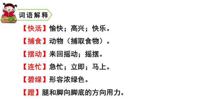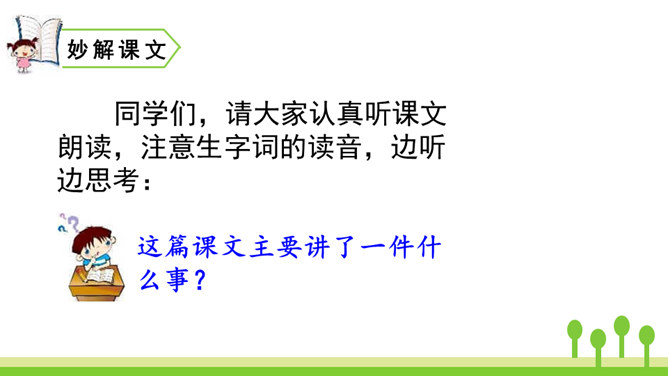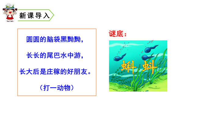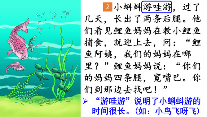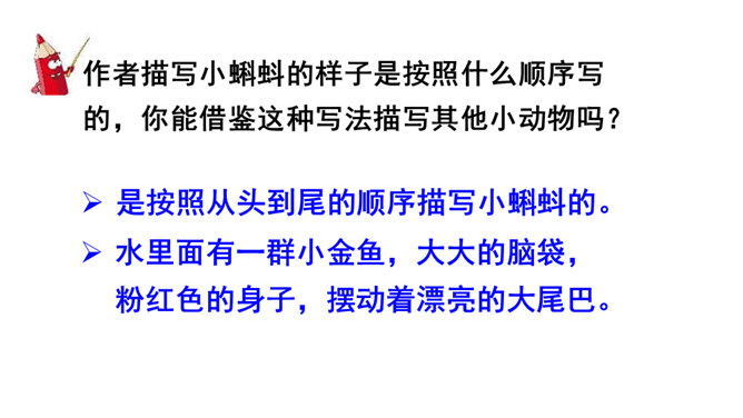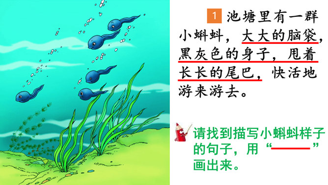 同学们,请大家认真听课文朗读,注意生字词的读音,边听边思考:这篇课文主要讲了一件什么事?作者描写小蝌蚪的样子是按照什么顺序写的,你能借鉴这种写法描写其他小动物吗?是按照从头到尾的顺序描写小蝌蚪的。水里面有一群小金鱼,大大的脑袋,粉红色的身子,摆动着漂亮的大尾巴。“游哇游”说明了小蝌蚪游的时间很长。(如:小鸟飞呀飞)小蝌蚪第一次变身是什么样子?长出了两条后腿。所属专题:小蝌蚪找妈妈ppt。