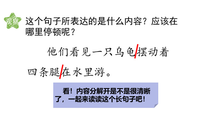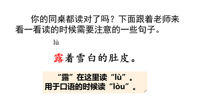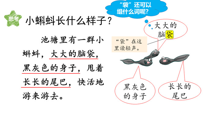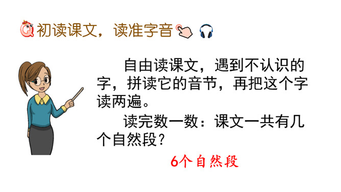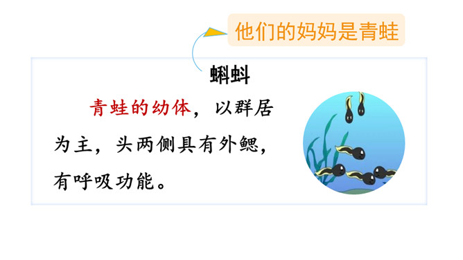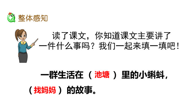 同学们,从今天起,我们开始学习本册教科书的第一单元。本单元有3篇课文,都讲了大自然的秘密,读起来可有趣了!好,跟老师一起学习吧!自由读课文,遇到不认识的字,拼读它的音节,再把这个字读两遍。读完数一数:课文一共有几个自然段?6个自然段。同桌轮读课文,每人读一个自然段。如果对方有没读对的地方,请你帮忙改正。你的同桌都读对了吗?下面跟着老师来看一看读的时候需要注意的一些句子。所属专题:小蝌蚪找妈妈ppt。