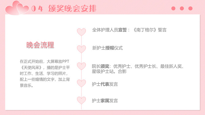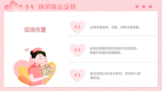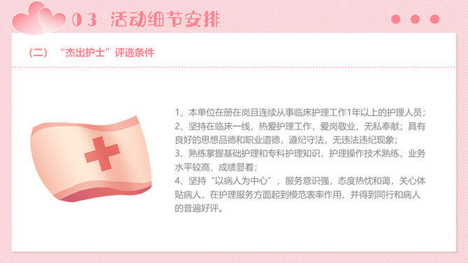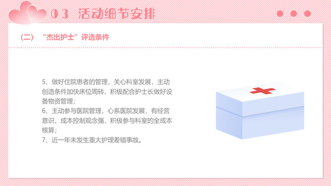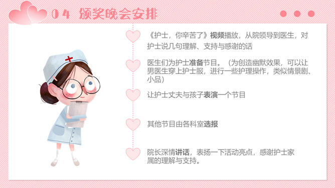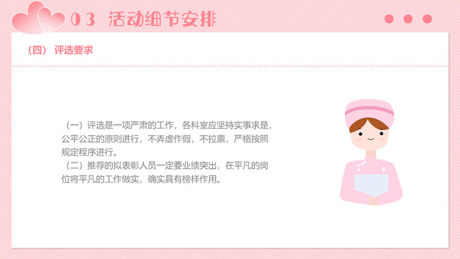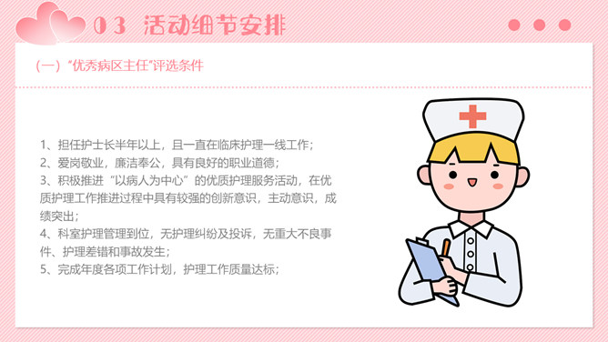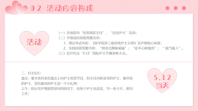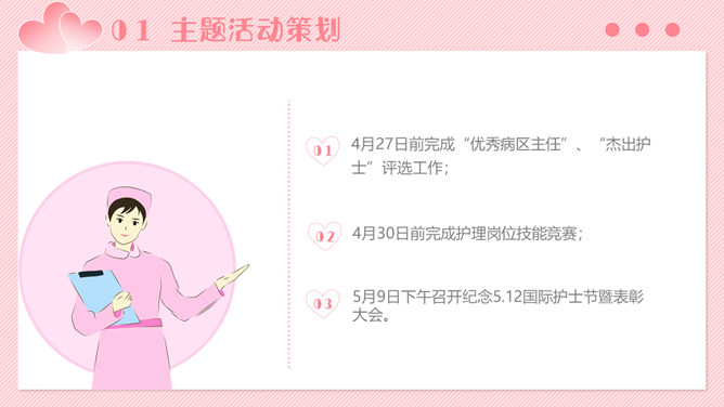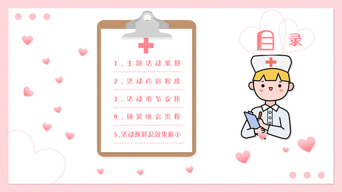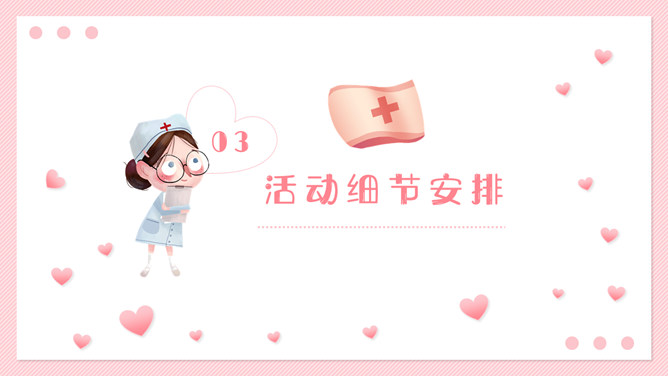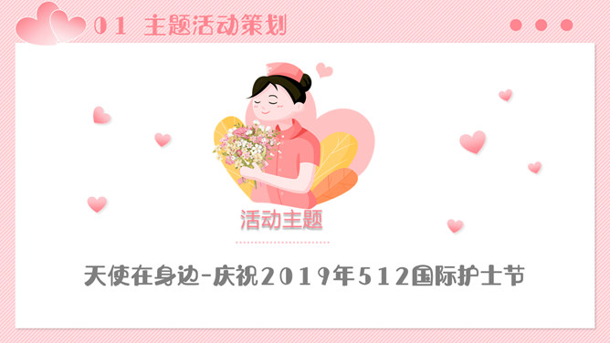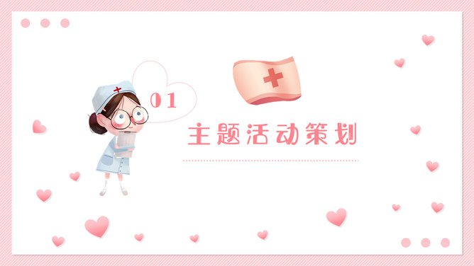 五一二国际护士节PPT模板。一套护士节主题模板,粉色主色调,爱心装饰,卡通风格,适合护士节活动策划等。