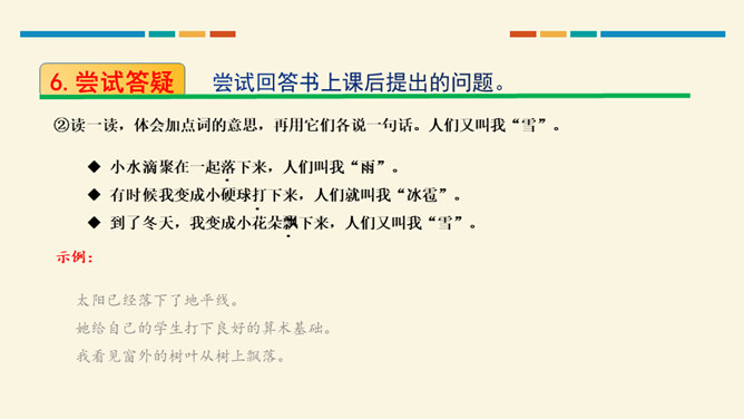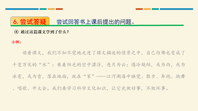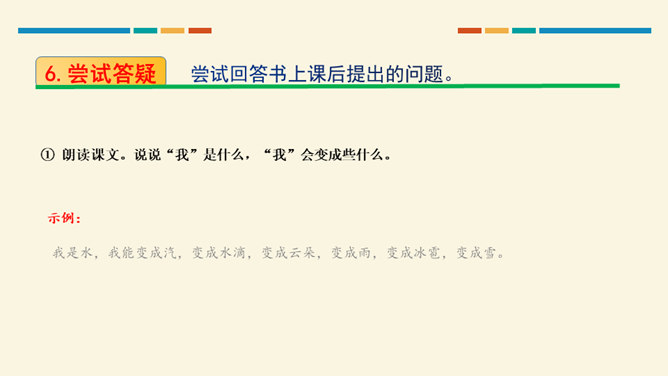 通过这篇课文学到了什么?读着课文,我们不知不觉地走进了课文描述的情景之中,自己仿佛也变成了千变万化的“水”:乘着阳光的空中漂浮,连片为云;遇冷凝结,或为雨,或为冰雹,或为雪,落在地面,就在“家”——江河湖海中睡觉、散步、奔跑、跳舞、唱歌、开大会。我们要学习科学文化知识,让它光做好事,不做坏事。朗读课文。说说“我”是什么,“我”会变成些什么。我是水,我能变成汽,变成水滴,变成云朵,变成雨,变成冰雹,变成雪。所属专题:我是什么ppt。